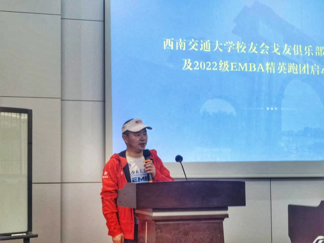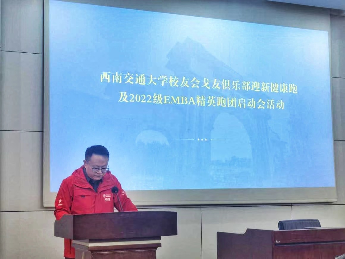 On the afternoon of March 4, 2023, the Southwest Jiaotong University EMBA Alumni Association Ge You Club Health Run and 2022 EMBA Elite Running Team Launch Event was held as scheduled in the 0215 lecture hall of Building 0 on the Jiuli campus. Guo Qiang, Executive Dean of the School of Economics and Management, Yan Libin, Deputy Secretary of the Party Committee, and Li Liang, Vice Dean, Wu Jun, Deputy Secretary of the Party Committee of the School of Foreign Languages, Liu Kun, Director of the Domestic Cooperation and Education and Training Management Office of the school, Huang Dengshi and Guan Zhenzhong, teacher representatives of the school, He Peng and Zhu Bo, Executive Deputy Director and Deputy Director of the Professional Degree Education Center, Zhang Xiaoyun, Deputy Director of the Domestic Cooperation and Alumni Affairs Center, Huang Jinling and Song Jie, class advisors of the 2022 EMBA program, and Yuan Xiaorong from the Professional Degree Education Center, as well as representatives from the Southwest Jiaotong University EMBA Alumni Association Ge You Club and the 2022 EMBA students, attended the event.