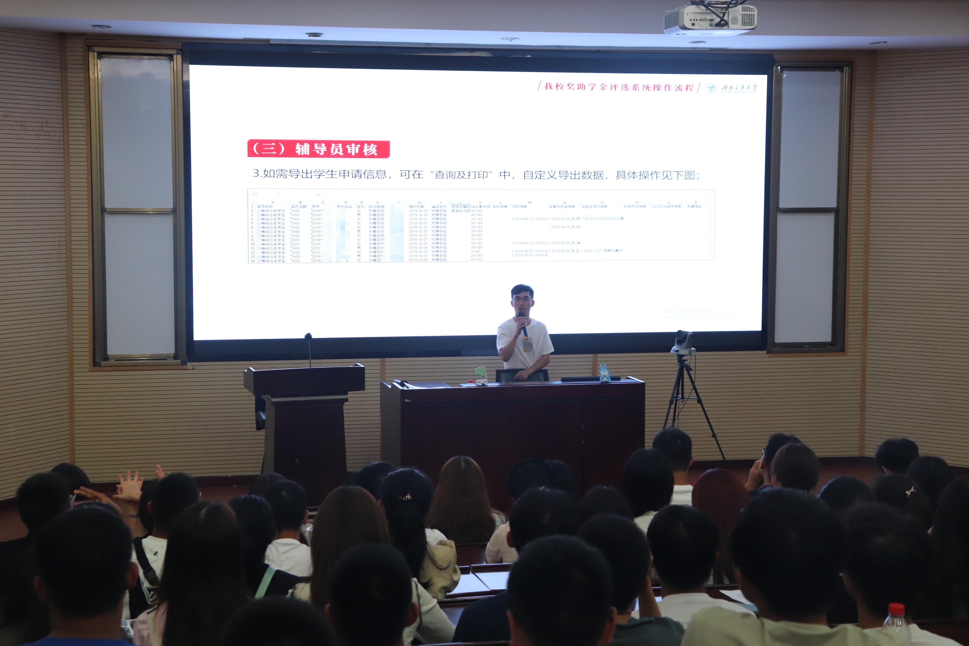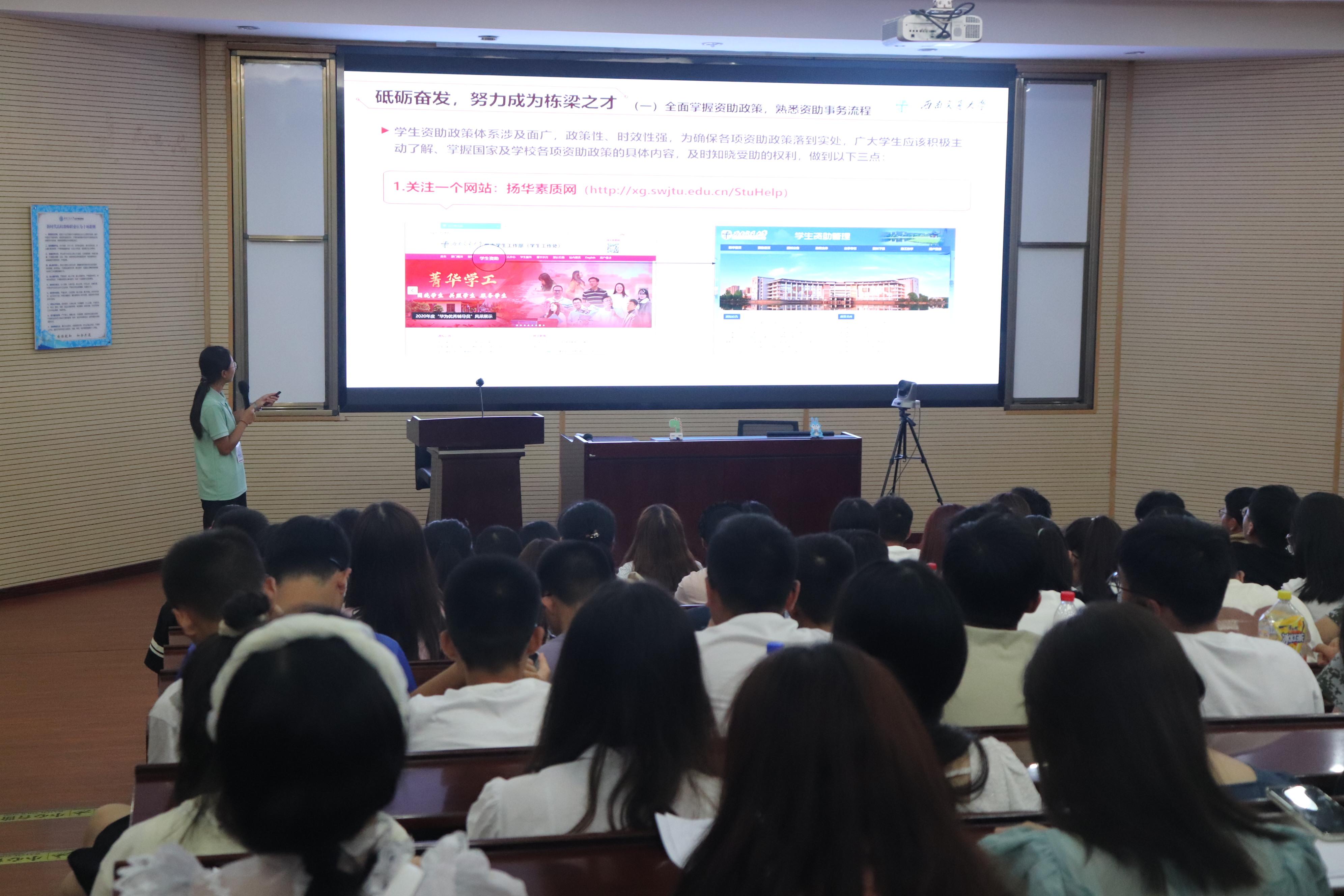 本科2023级全体新生分别在J0202、J0215参加入学教育系列讲座之资助政策宣讲活动。学生工作组副组长王哿、辅导员苏扬和学校小资小助宣讲团成员为同学们详细讲解了有关学生资助体系、国家助学贷款、本科生各类奖助学金评选、家庭经济困难学生认定等知识。