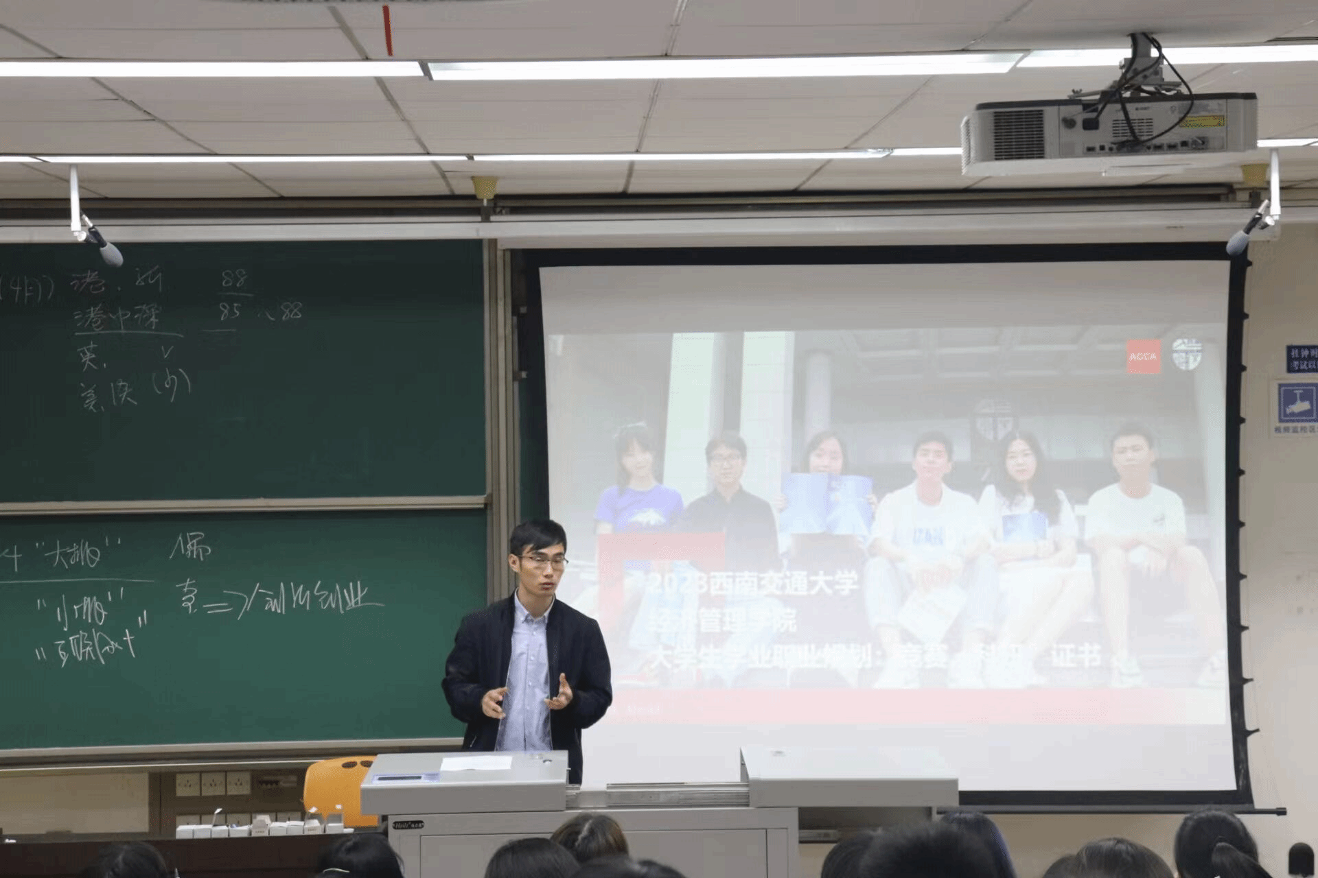 本科2023级在九里校区J4309、J4310、J4318和J4319教室举行了生涯规划教育活动, 本次活动由杨言鑫老师和王静老师进行主讲。两位老师通过幽默的形式与详实的讲述,向同学们讲解了如何进行学业规划、职业规划,介绍了参与科研竞赛的意义与流程,旨在帮助同学们更好地规划自己的学业生涯。