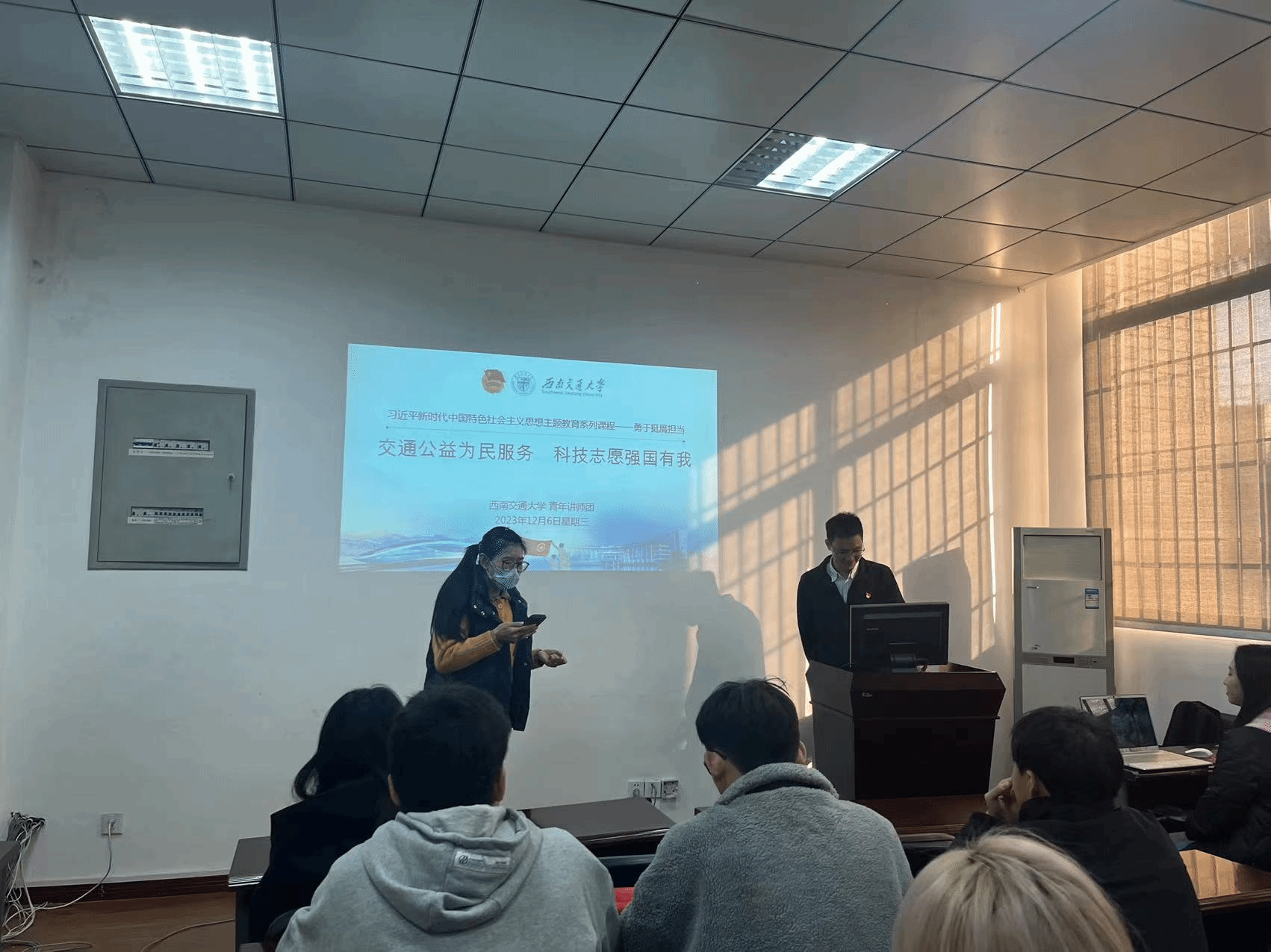 青年讲师团成员,环境科学与工程学院团委书记杨都强同志为硕士2023级2班在九里校区信息楼J0217进行了以“交通公益为民服务,科技志愿强国有我”为主题的宣讲。此外,参与本次活动的还有糖心Vlog