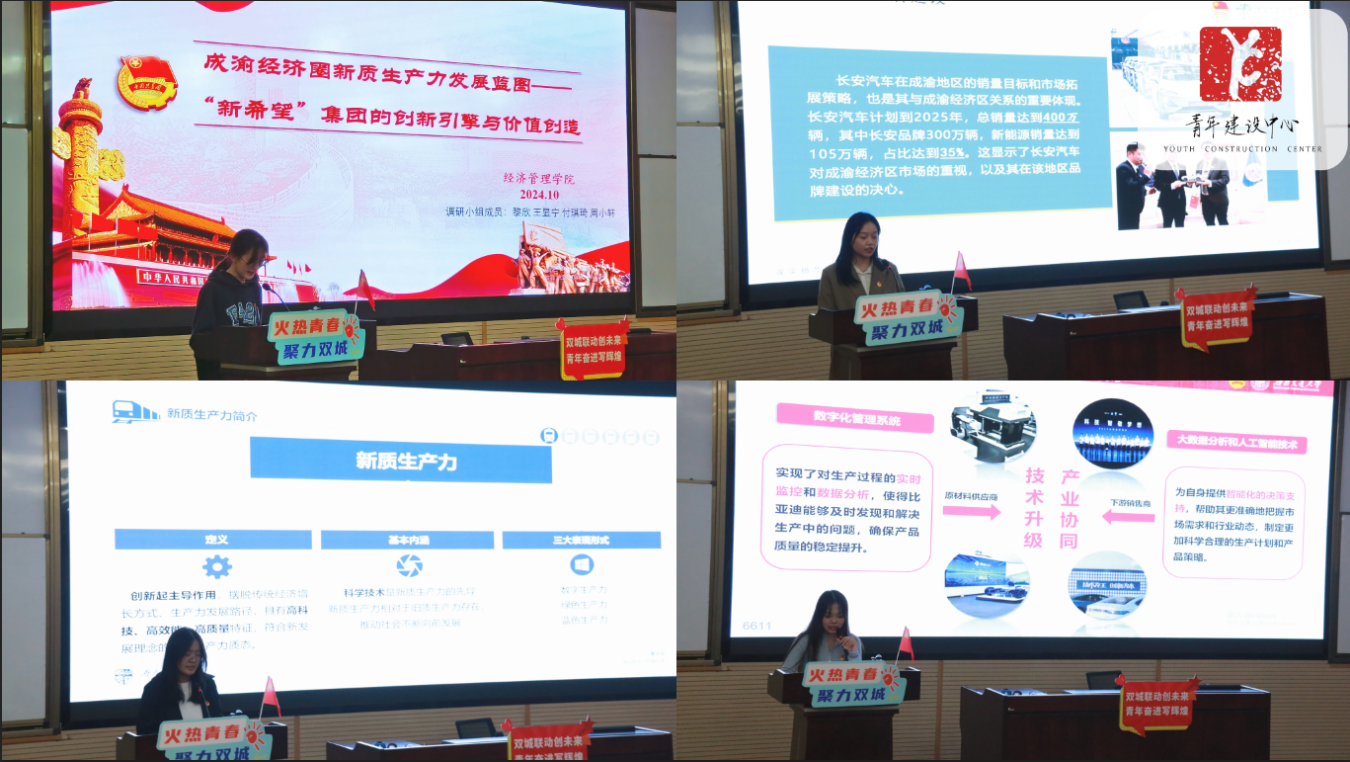 第五项议程——有用。个人分享报告结束后,付琦琪、丁洁、李博闻、李雪晴同学分别以“新希望”集团、长安汽车、宁德时代、比亚迪为例,分享小组调研结果和收获,让团员青年们了解了成渝双城经济圈中代表企业的新质生产力的发展情况,鼓励团员青年们在学以致用、实干有为的实践中找准时代定位、把握青年机遇,在互动共建、总结运用的联动中共建双城圈、携手一起走。