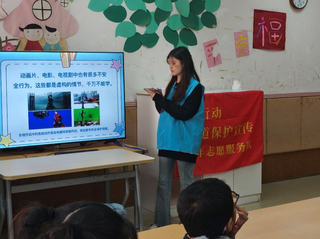 在“危险的事情我不做”部分,志愿者通过图片、动画等直观的形式,向小朋友们介绍了日常生活中可能存在的安全隐患,如不随意触摸电器插头、不在马路上玩耍等,帮助孩子们识别身边的潜在危险。