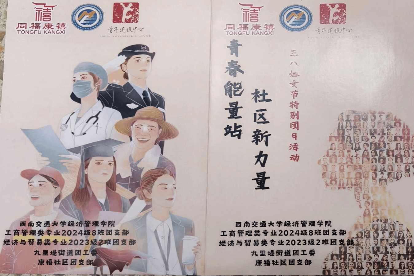 委员会和九里堤街道社区一起开展了“青春能量站,社区新力量——了不起的中国女性”,具体参与本次主题活动的是工商管理类专业2024级8班团支部和经济与贸易类专业2023级2班团支部以及康禧社区团支部。