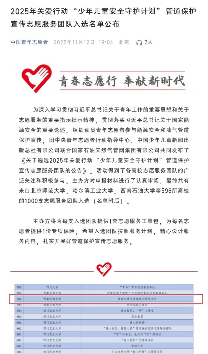 学院团委积极响应号召,积极组织学生志愿服务队报名参与遴选。近日,大学生志愿服务团队入选名单已公布,我院“青鸽志愿服务队”从全国千余所高校的数千支队伍中脱颖而出,成功入选2025年关爱行动“少年儿童安全守护计划”管道保护宣讲志愿服务团。