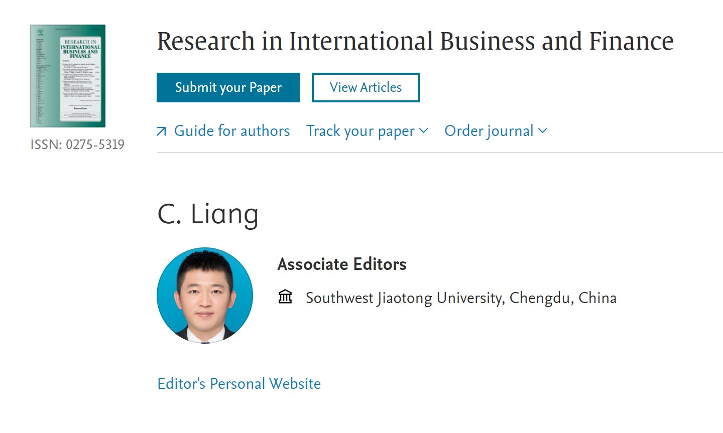 同时,我院梁超老师受美国阿克伦大学金融系教授John W. Goodell主编邀请,正式加入Research in International Business and Finance编委会,出任该刊副主编。Research in International Business and Finance是国际SSCI索引期刊,JCR1区,主要研究领域为金融市场、金融机构、行为金融等方面。2021年最新影响因子为6.143。