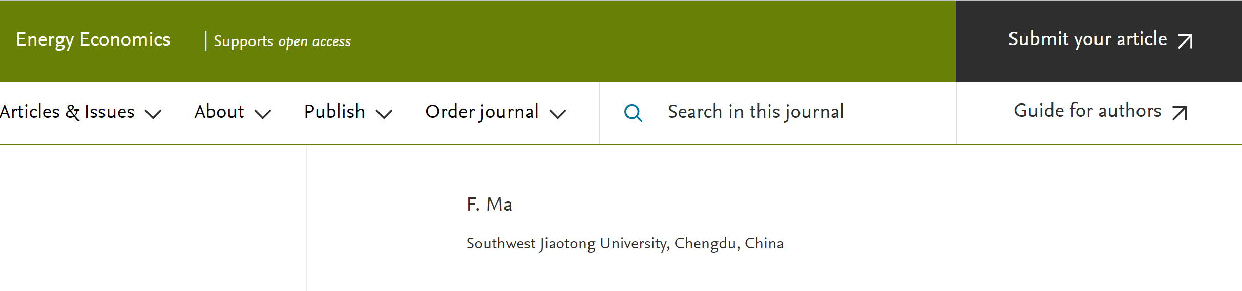 近日,我院马锋副教授应英国萨塞克斯大学教授Richard S. J. Tol主编邀请,正式加入Energy Economics编委会,出任该刊副主编。Energy Economics是国际SSCI索引期刊,JCR1区,ABS 3,澳大利亚ABDC期刊列表A*类顶级期刊,在能源经济领域具有广泛的影响力,研究领域覆盖能源经济、能源金融、能源与环境等方面,是我国能源学术界、实务界等进行能源问题研究及决策时的重要参考,2021年最新影响因子为9.252。