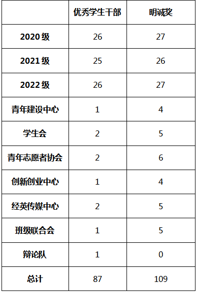 4. 校级学生组织推荐的“优秀学生干部”、“明诚奖”不占用学院名额,由党委学生工作部牵头开展校级学生组织“优秀学生干部”、“明诚奖”评议、推荐工作,并将相应名额追加至各学院。