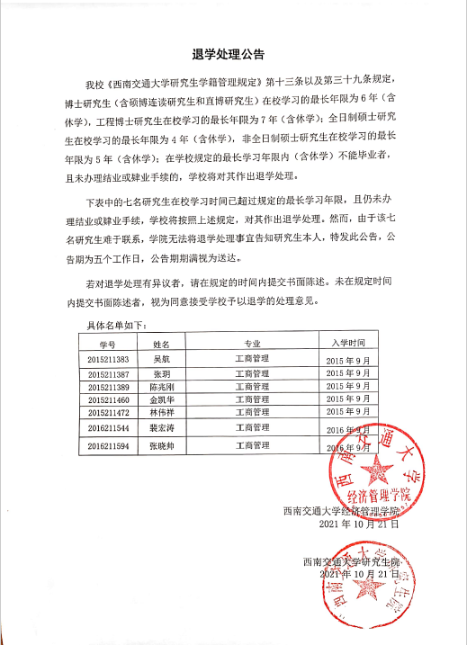 退学处理公告