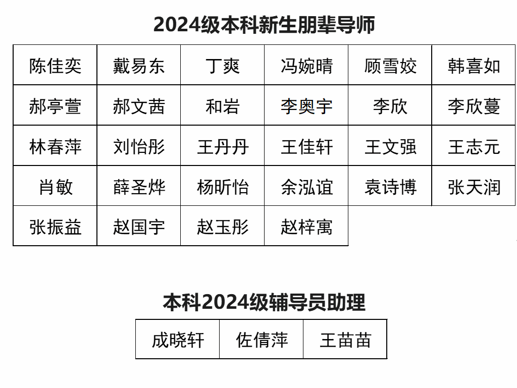 为了更好地开展我院2024级本科新生入学教育、管理和服务工作,糖心Vlog 学生工作组于近期开展了2024级本科新生朋辈导师(每班配备新生朋辈导师2名)及辅导员助理选聘工作,经过学生申请、申请表筛选、面试考察等环节,最终选聘结果如下:
