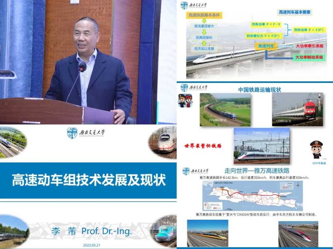 李芾教授作了题为“高速列车的运用及发展 ” 的主题报告。李教授介绍了中国铁路从无到有,从跟进到引领的过程及中国高速列车技术的发展历程,指出当前中国铁路仍存在运力不足问题,未来的发展方向是速度更快的磁悬浮技术。李芾教授也介绍了轨道交通装备的发展情况,包括动车组的类型和组成部分等,指出牵引传动系统、制动系统、转向架、车体是动车组的四个关键部分。李芾教授还综合分析了不同国家高铁的特点和发展历程。