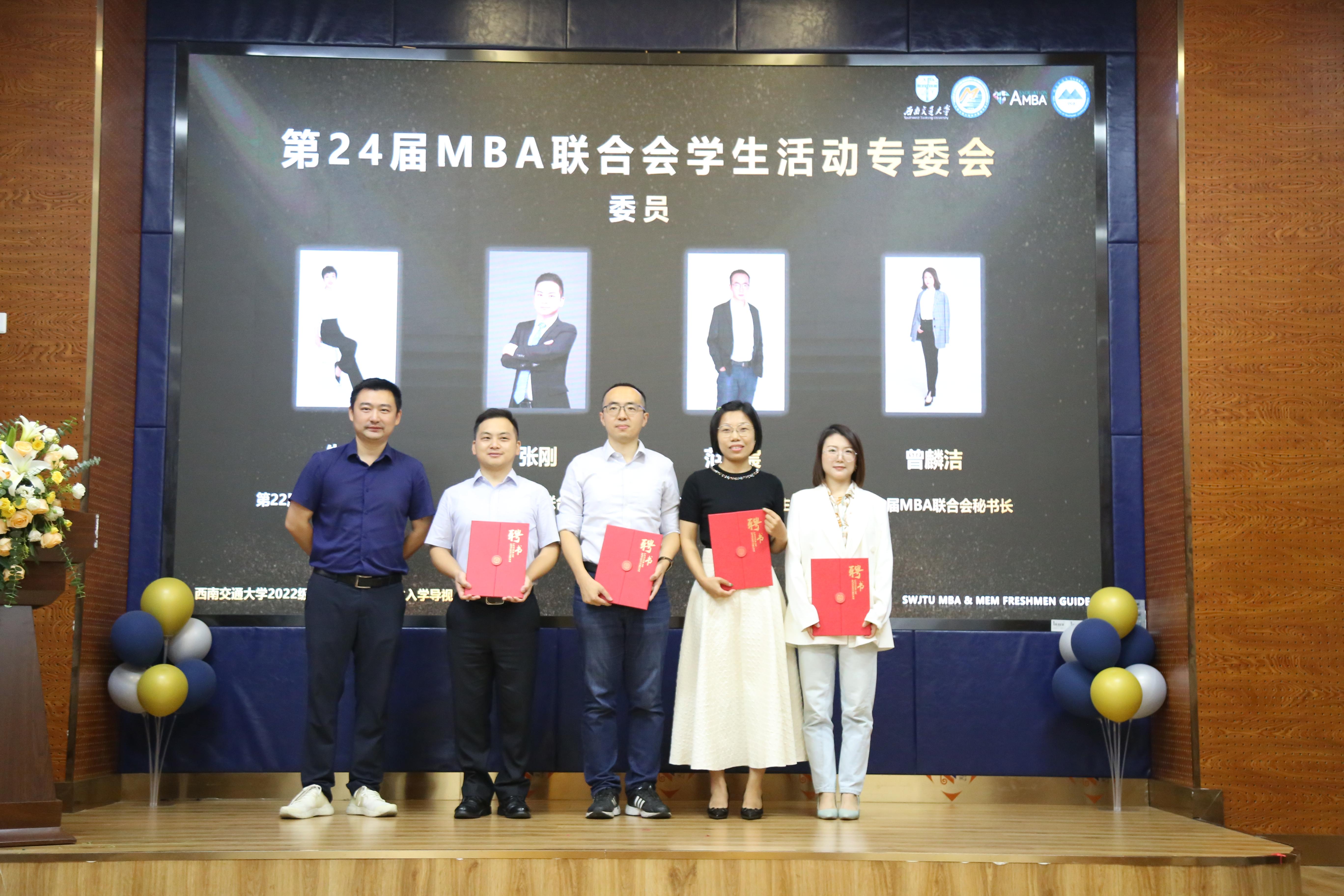 工会主席、综合事务办公室主任晏理斌为学生活动专委会委员张刚、范宇宸、朱琳、曾麟絜颁发了聘书。作为往届MBA联合会优秀的学长学姐,他们将会为新一届联合会主席团提供更多指导和帮助。