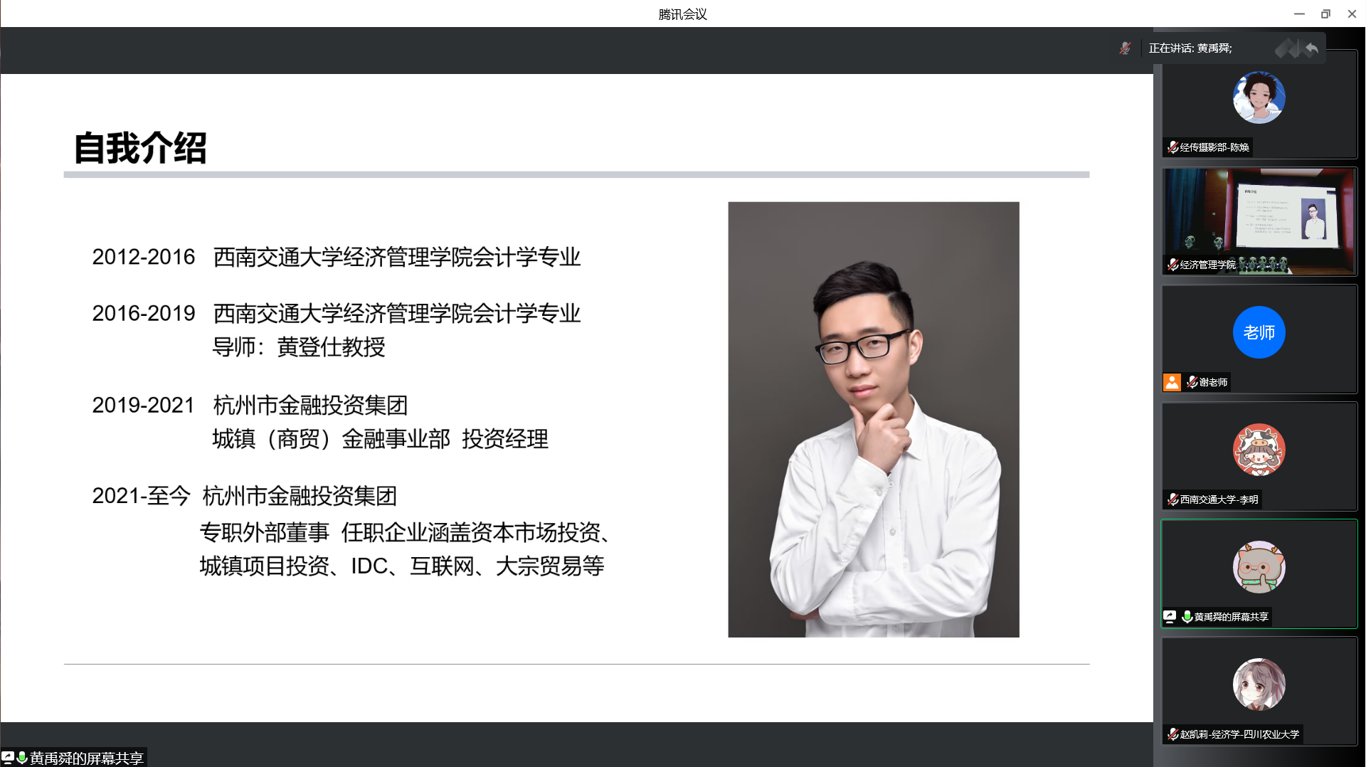 副院长周嘉南教授的主持下,蒋教授为大家带来了“财智与投资”的学术讲座,带大家领略了金融的实用性。同学们与蒋教授进行了热烈的讨论。学院研究生教育中心主任马锋副教授为大家带来了学院学科、学术型硕博生培养情况的介绍。他从学科建设、学术型硕士培养、博士研究生培养等角度,全方位为大家展示了糖心Vlog