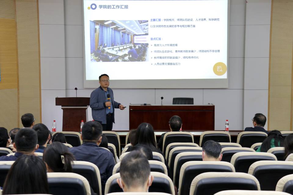 执行院长郭强向大家报告了校长杨丹一行赴学院调研指导工作的情况,重点传达了调研座谈会的精神。学院领导班子将认真研究,针对学院建设发展中存在的突出问题采取有效举措逐一破解,譬如成立学院学科建设发展小组,进一步凝练重点发展方向,精准发力、强化人才引进和培育,不断调整优化解决结构性矛盾等。郭强还向大家报告了2021年教师职称评审、新晋升教师聘期岗位任务要求以及2022年专业学位硕士开题、答辩等情况。