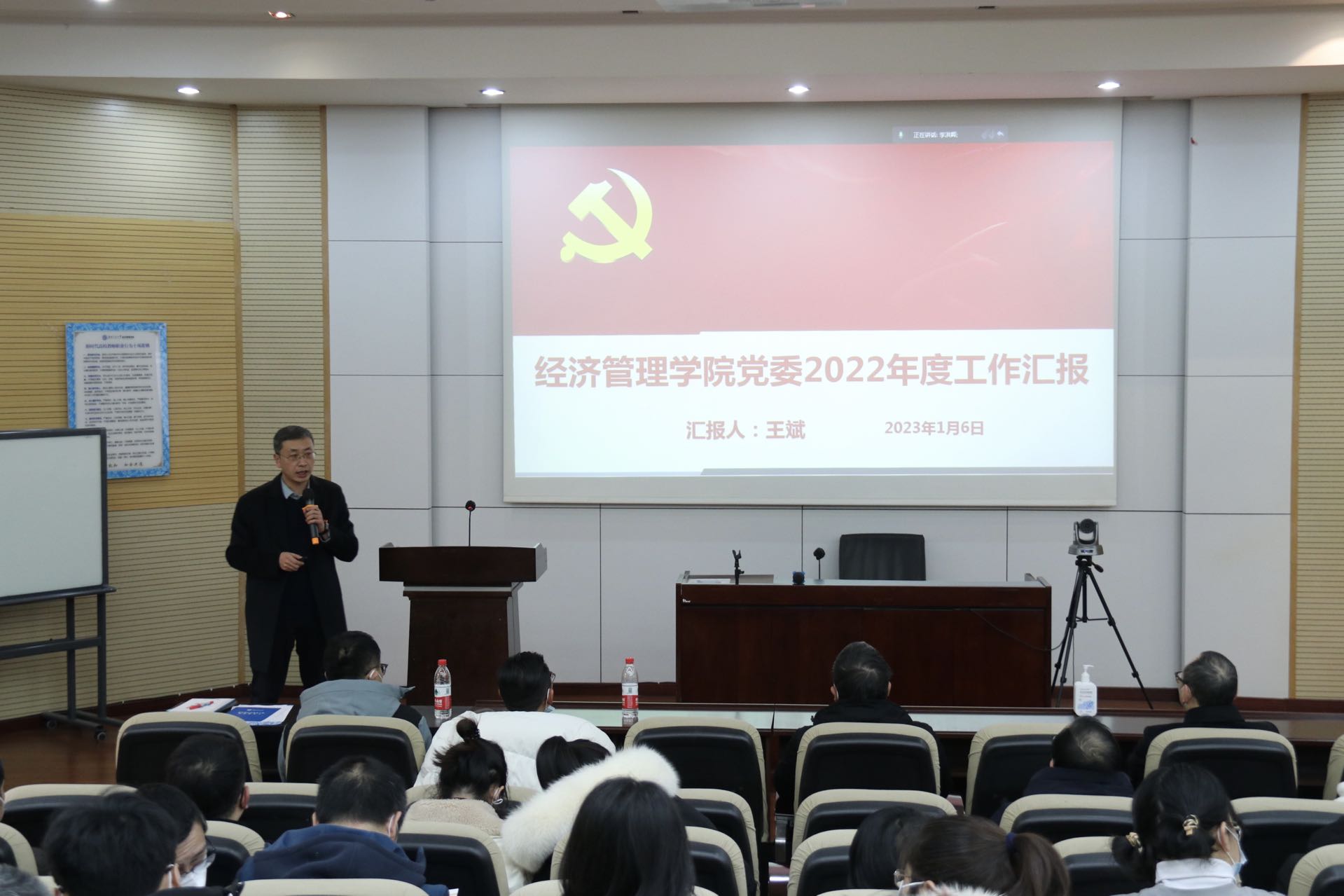 王斌在会议主持中强调,本学期已近期末,尤其受疫情影响,给各项工作带来一定的困难,请学院全体师生坚持做好期末的各项工作,安排好寒假及下学期开学前的各项工作,要特别重视安全稳定,在用水用电、防火、防骗以及意识形态、师德师风等方面,落实落细各项具体工作,防患于未然。衷心感谢大家一年来的辛勤工作和辛劳付出!祝全院师生新年快乐、新春愉快、健康平安!