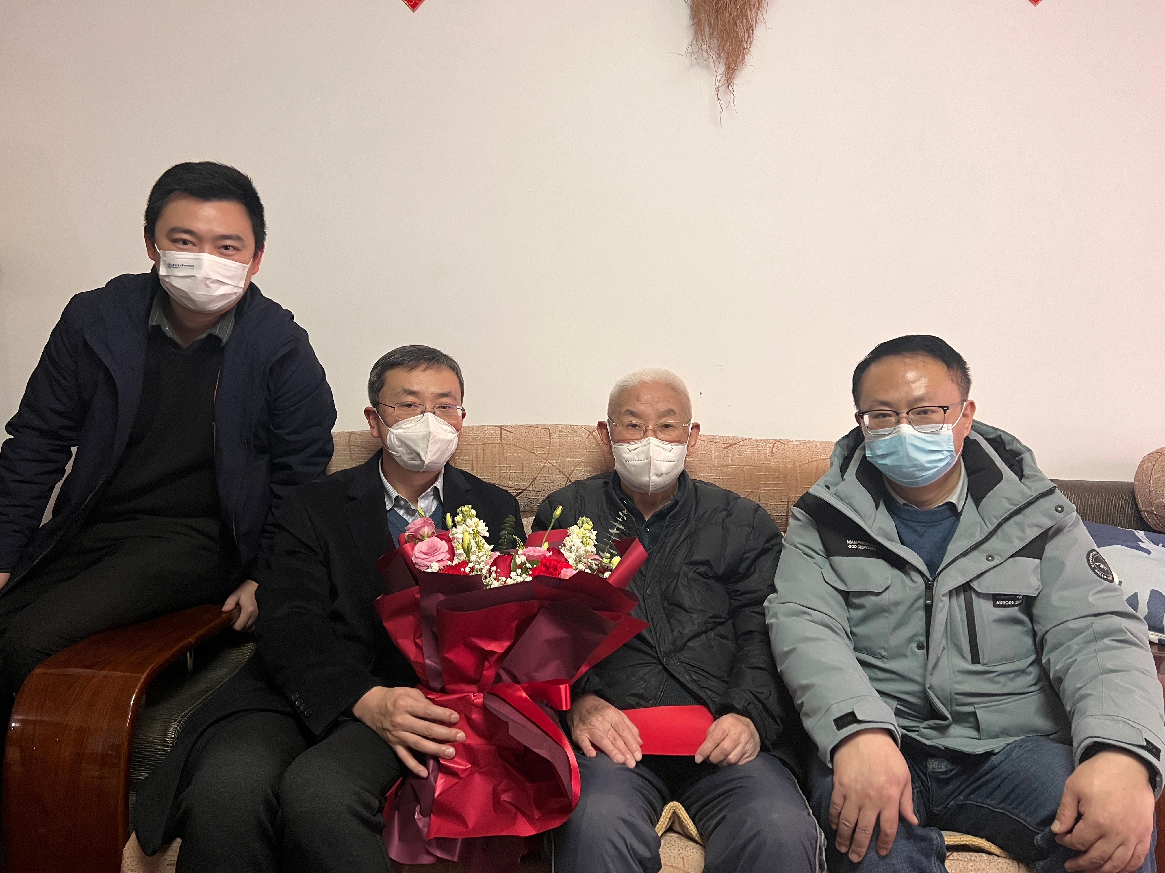 学院党委书记王斌、执行院长郭强、党委副书记晏理斌等一行来到曹琦教授的家中,详细询问了曹老师的身体情况和生活现状,与他促膝而谈,并对老教授多年来为学院事业发展的付出表示感谢,祝愿老教授们在新的一年身体健康、阖家幸福。