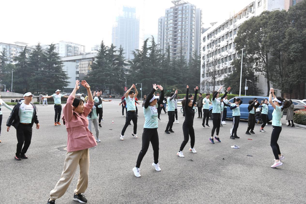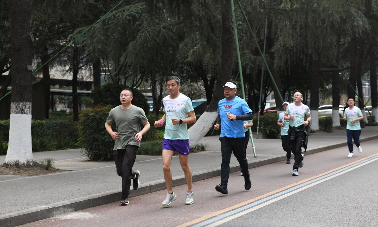 启动会毕,由专业教练带领进行热身活动之后,师生校友们身着EMBA戈赛运动服从0号楼出发,踏上平时熟悉的一寸寸校园土地,浩浩荡荡的队伍犹如一条长龙穿梭在校园,形成一道亮丽的风景线。师生校友们途经逸夫馆、运动场、镜湖,沿着唐臣路,最终返回0号楼顺利跑完全程。短短2公里的健康跑,代表的是对EMBA校友会戈友会俱乐部的传承,迈出奋发的步履,奔向更好的明天。