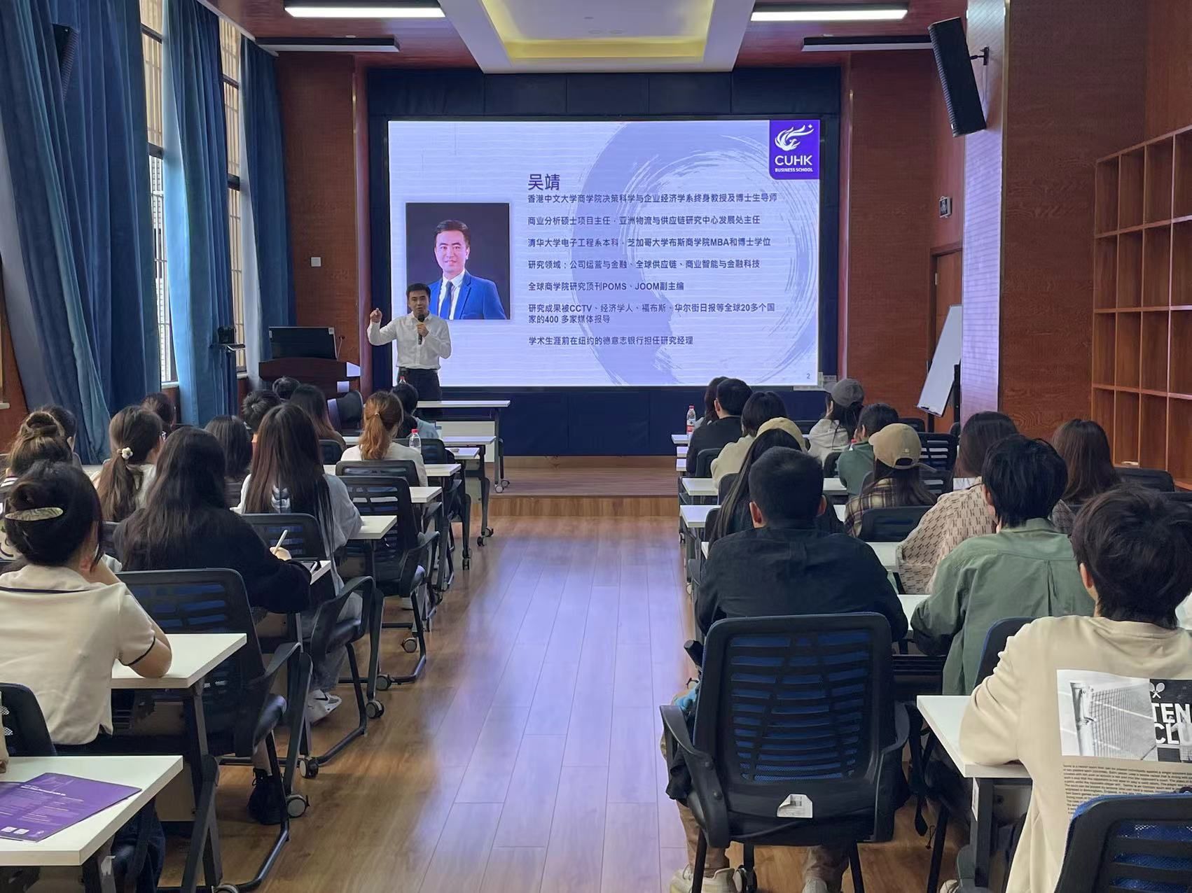 随后吴靖教授对香港中文大学进行简单的介绍。香港中文大学(The Chinese University of Hong Kong)有着较高的QS世界大学排名,各个学院之间存在一定的自主性,发展也较快,并取得多项荣誉,同学们通过展示视频感受到了香港中文大学的校园魅力。吴靖教授从案例出发,通过当今热门的人工智能、校友发展情况等实际事例,向同学们展示商业分析数据模型的厉害之处。同时,他也强调理商融合的理念,引出此次宣讲的商业分析硕士项目。全日制硕士学习路线有多个培养项目,如BA、MAcc、MiM等,在三学期制的学制下,项目通过课程学习、教学实践等方式来培养人才,同时吴靖教授也提出希望进入项目学习的同学能够充分发挥主观能动性,不断深化学习。