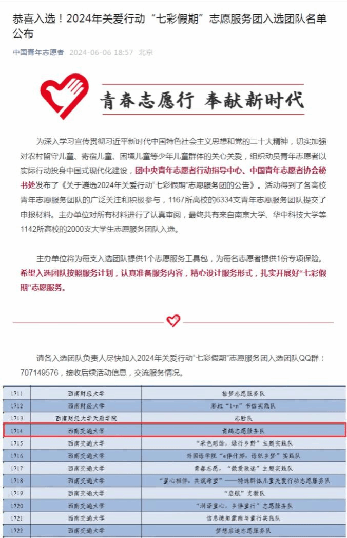 同时,为深入学习宣传贯彻习近平新时代中国特色社会主义思想和党的二十大精神,切实加强对农村留守儿童、寄宿儿童、困境儿童等少年儿童群体的关心关爱,组织动员青年志愿者以实际行动投身中国式现代化建设,团中央青年志愿者行动指导中心、中国青年志愿者协会秘书处面向全国高校遴选2024年关爱行动“七彩假期”志愿服务团。