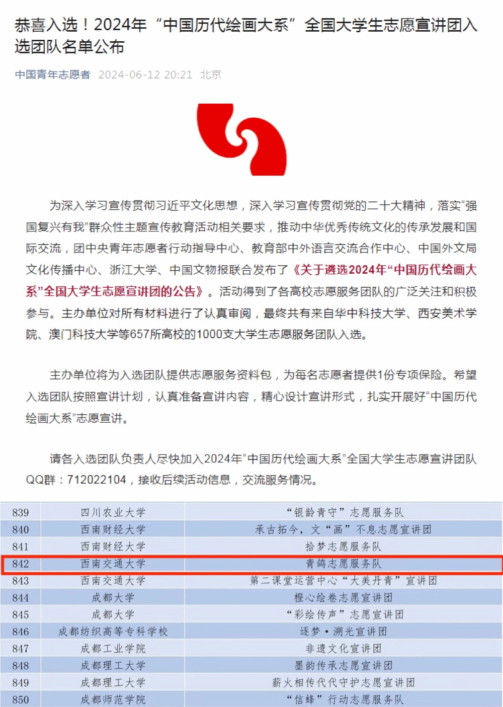 学院团委积极响应号召,积极组织学生志愿服务队报名参与遴选。近日,大学生志愿服务团队入选名单已公布,我院“青鸽志愿服务队”从全国千余所高校的几千支队伍中脱颖而出,同时入选“2024年中国历代绘画大系”志愿宣讲团和2024年关爱行动“七彩假期”志愿服务团。