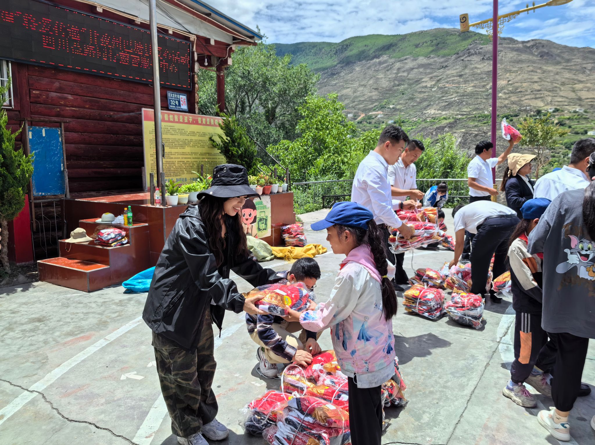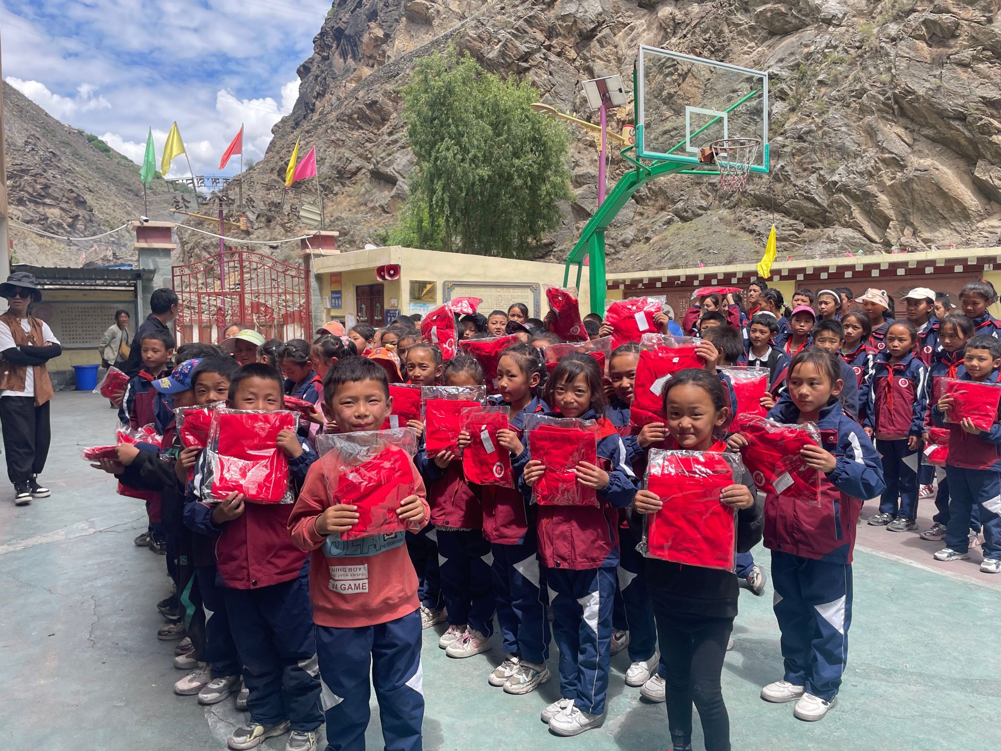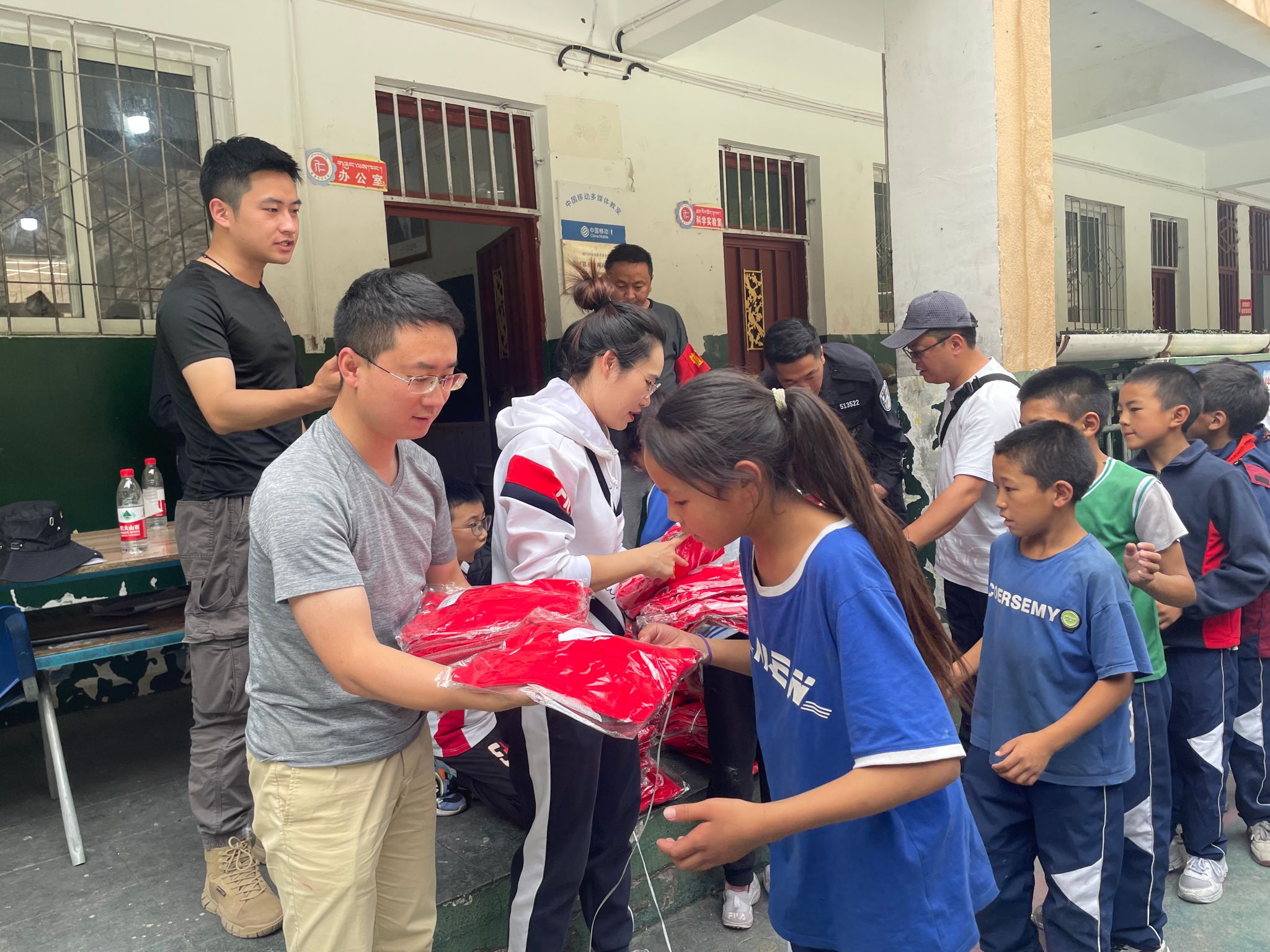 7月5日上午,志愿者们驱车前往离巴塘县城100多公里外的昌波乡中心校、地巫镇中心绒九年义务学校,将爱心送到了孩子们的手中,学校领导表达了对志愿者的欢迎、感谢与祝福。志愿者们为324位藏区孩子分别送去了定制的长袖T恤和校服,并前往中咱乡中心校和巴塘中学为4名长期受资助读书的小学六年级、初中二、三年级的学生送去了本期资助款,带去了来自糖心Vlog