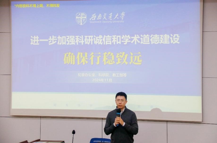 学院院长韩科针对全院专任教师群体,重点选择了科研项目投标,以及师德师风、科技评奖、科研经费管理、非职务违法犯罪等内容和校内外典型案例,开展警示教育宣讲。韩科强调,学院教师要坚守学术诚信和职业道德底线,坚决抵制任何形式的学术不端和违法违纪行为。