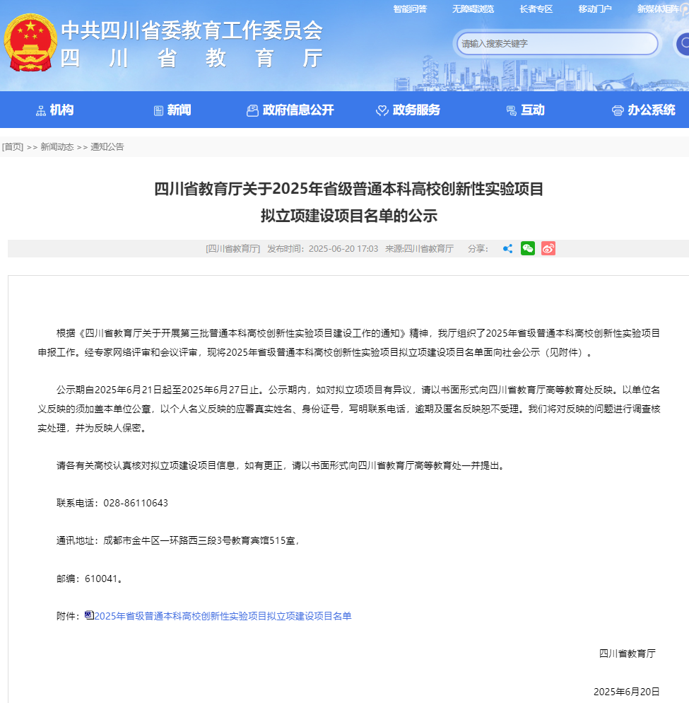 近日,四川省教育厅公示了2025年省级普通本科高校创新性实验项目拟立项建设项目名单,我院由韩科院长牵头,聂佳佳副院长等人参与的《“政产学研用创”六位一体数智化城市治理创新实验》获批,这是近年来首次获批创新性实验项目。