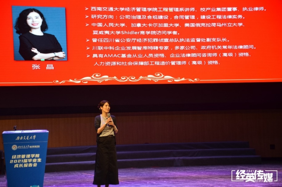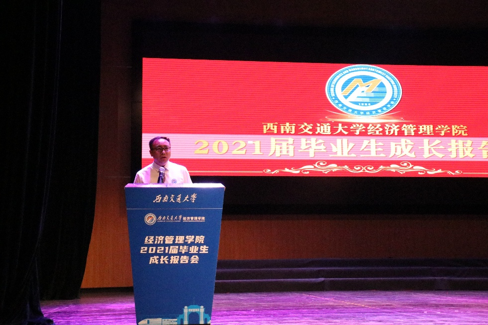 国歌奏唱完毕,执行院长郭强致辞。他首先代表在外出差的学院党委书记王斌以及学院党政领导班子对圆满完成学业的同学表示衷心祝贺,对不辞辛苦、默默付出的老师和家长表示诚挚感谢。郭强指出,此次毕业生成长报告会不仅是对过去的总结,更是对未来的展望。在中国共产党成立一百周年之际,毕业生们不仅怀揣着自己的梦想,也承载着党和国家的期许,应当肩负起复兴祖国的重任。他向毕业生们提出三点希望:一是要坚定理想信念,勤奋耕耘,不断进取,追求卓越;二是要勤于学习,勇于实践,不断提高自身素质,努力成才;三是要肩负责任,勇于担当。他强调,毕业同学们要心怀“竢实扬华,自强不息”的交大精神,传承“格物致知,和合共进”的经管院训,在崭新的未来征途中,书写更为精彩的人生篇章。