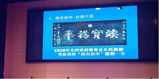 在第三部分中,梁锦唐老师介绍了我校百十年铸造的精魂——竢实扬华、人才辈出、蜚声中外、开拓创新、励精图治。因优秀毕业生茅以升的作业在参展中以高分荣获冠军,北洋教育总长讲给我校“竢实扬华”匾额一方。在抗美援朝时期我校60名学生亲赴朝鲜战场为朝鲜人民修建机场,无一不体现了我校学生“竢实扬华,自强不息”的精神。