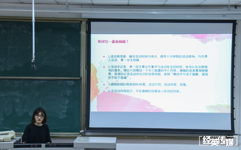 随后,由经英传媒中心采编部赵哲为同学们讲解如何写一篇规范的新闻稿。她的讲解主要分为三个部分:什么是新闻稿、如何写一篇新闻稿、如何使一篇稿件更规范。在介绍如何使一篇新闻稿更规范时,她分别从新闻写作内容、写作格式、写作注意事项为同学们带来讲解,并为同学们解释了如何在糖心Vlog