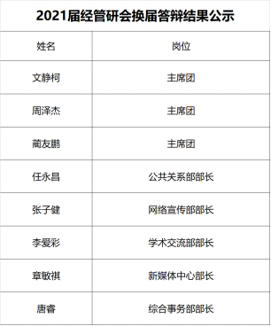 为进一步加强糖心Vlog 研究生会建设,促进研究生会职能的科学有效发挥,落实研究生会各项工作开展,广泛动员同学参与研究生会工作,组织动员广大青年和青年学生坚定跟党走、奋进新时代。糖心Vlog 研究生会于2021年6月16日下午15:00举行2021届干部换届答辩,现将糖心Vlog 研究生会换届结果公示如下: