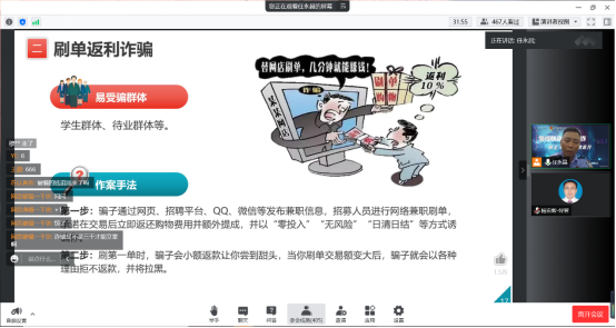 党委副书记杨宏毅叮嘱新生同学们,要提高对电信诈骗的重视程度,要建立起防诈骗的意识,也要从以往的实际案例中汲取经验和教训。紧接着赵警官以“筑堤九里,守护平安”为主题,从4个方面3个维度向大家普及了防范电信诈骗的基本知识。系统阐述了“什么是网络诈骗”,“为什么要防范网络诈骗”。在搞清楚“什么是”和“为什么防”后,赵警官凭借多年防诈骗工作经验为大家列举了十种常见的诈骗套路,包括刷单返利诈骗、杀猪盘诈骗、冒充熟人或领导诈骗等。不得不称赞诈骗份子手段之“高明”,让人防不胜防,也不得不唾弃其毫无底线,无孔不入。面对层出不穷,不断更新换代的“诈骗方案”,赵警官手把手地指导同学们如何识别并防范网络诈骗,将其归纳为“无法确定身份的人物使用电话、网络等工具,要求你转账汇款或者输入敏感信息”这一“公式“。凡是可以用这个“公式”描述的行为,大概率就是诈骗,就需要同学们“敬之”、远之,保持清醒、守住底线。