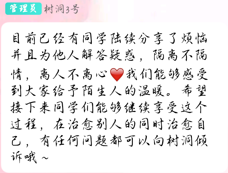 班级联合会积极响应,组织 “解忧树洞 从心开始”线上心理活动,透过屏幕传递温暖,为同学们提供了一个处理负面情绪的平台。