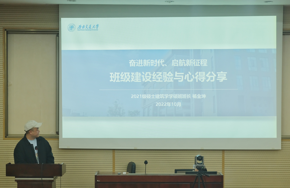 第二位班委是来自建筑学院PADP示范班级21级建筑学学硕班的班长杨金坤,他认为班级建设工作有一个重点,两个核心,三个围绕:一个重点是要做到长期积累,打持久战;两个核心是以群众力量为核心,以专业特色为核心;三个围绕是围绕时政、围绕优势、围绕集体,并通过对自身班级活动的举办过程总结开展活动的经验心得。