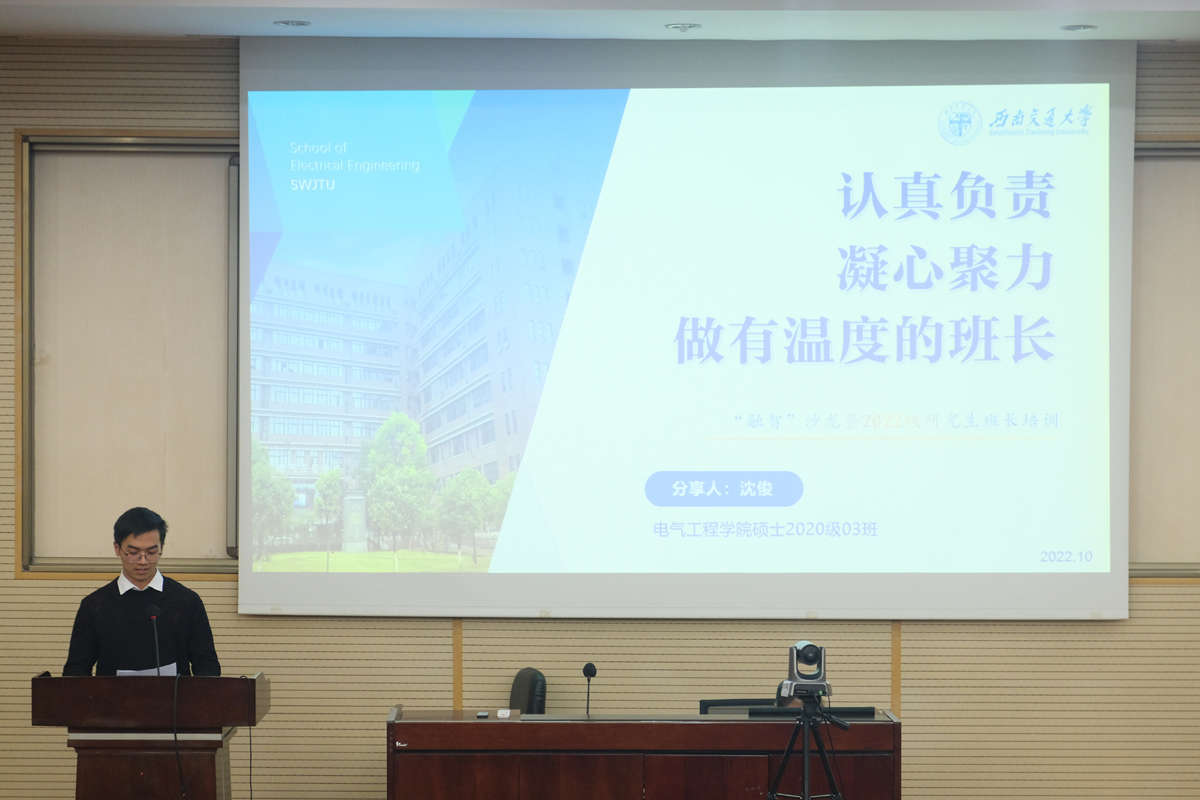 随后,来自电气工程学院研究生忠忱班集体的20级三班班长沈俊进行了班级建设经验分享。他指出对于班委管理制度要组织健全,分工合作;评奖评优制度要做到公平、公正、有效;通知宣传制度必须及时有效;要发挥班长作用,组织协调,知人善用。做好班级的各项事务是班级建设的基础。