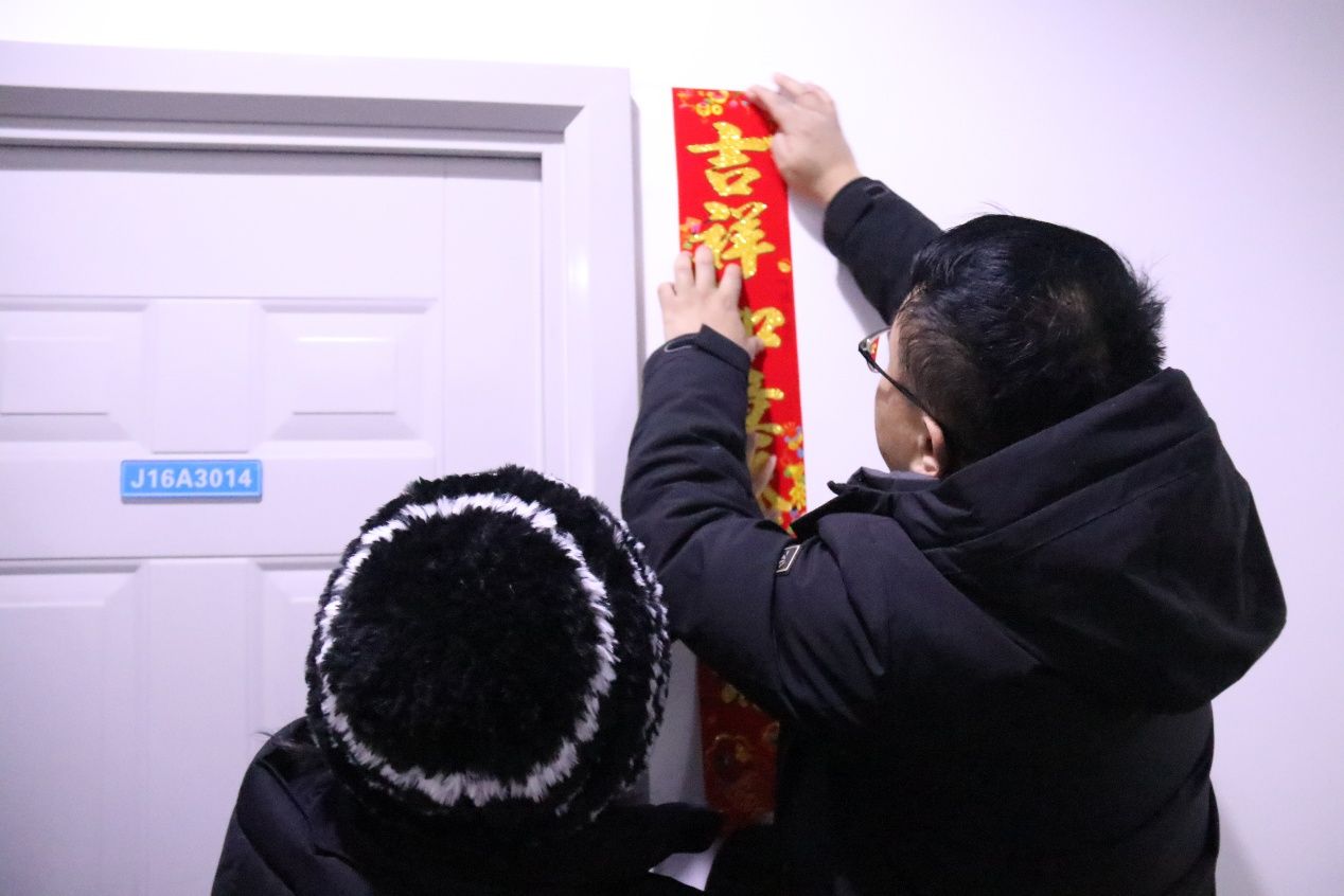 贴春联,献祥瑞。学院为留校的同学精心准备了春联、福字,党委书记郭强、院长韩科与同学们一同贴春联迎春纳福,留校同学们也纷纷亲手为宿舍贴上新春福字,“福”字不仅寄托着同学们对未来在校生活的美好向往,还承载着学院、老师们对同学们求学生涯的美好祝愿。一幅幅鲜艳的春联给宿舍增添了亮色,一句句祝福给同学们送去欢乐和温暖。祈福迎祥,岁月安康,送春联、贴福字活动不仅丰富了师生的寒假生活,弘扬了中华优秀传统文化,也为大家营造了欢乐、喜庆、祥和的春节气氛。