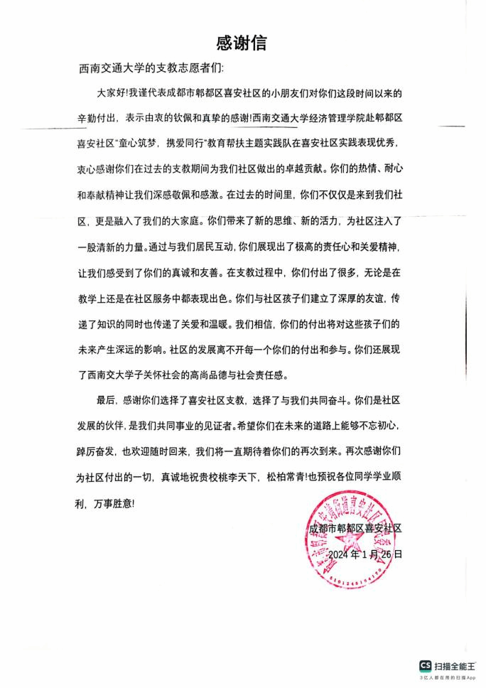 “有我伴你行”实践队以“扶智又扶志,青春新献礼”关爱未成年人教育帮扶为主题,走进四川省内江市威远县严陵镇,联合新时代文明实践所开展丰富多彩的主题实践活动。实践队员们为孩子们带来了丰富有趣的课程:地理小课堂、“心灵奇旅”电影欣赏课、“平安守护”安全科普课、“布艺工坊”织布手工课等,在拓展知识面的基础上,引导孩子们将所学所感与实际生活相结合。实践队还设计了关于传统文化的创新课程:“欢乐绘春节”绘画课,在培养同学们艺术爱好的同时,也扩展了他们的传统文化知识视野,培养了他们的民族认同感。在“剪影行云”剪纸课中,实践队员带着孩子们认识剪纸的主要形式和意义,在感受新春佳节氛围的同时,也不断学习中华民族传统文化。活动结束后,实践团队收到了来自吴荣路社区的感谢信。