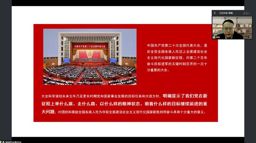 党课中,郭强首先介绍了中国共产党第二十次全国代表大会召开的意义、提出的任务和目标。随后,郭强遵循党的二十大报告“3”+“16”+“4”的结构带领大家回顾总结了新时代10年的伟大变革以及变革的伟大意义。