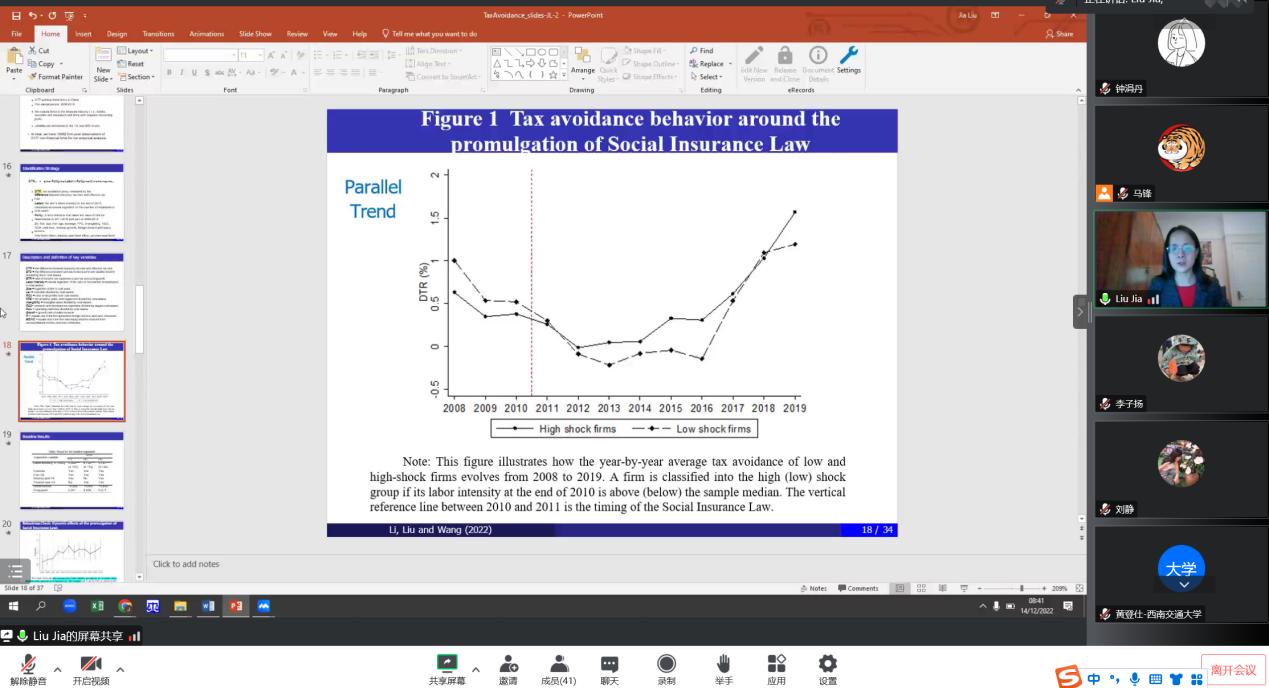 12月14日下午16点30分,应学院邀请英国朴茨茅斯大学商学院刘嘉教授带来了题为“Does the Social Insurance Law Influence Corporate Tax Avoidance?”的线上学术讲座。讲座由金融与财务学系马锋副教授主持,学院黄登仕教授,朱宏泉教授、诸波和梁超等教师及研究生参与本次学术交流活动。
