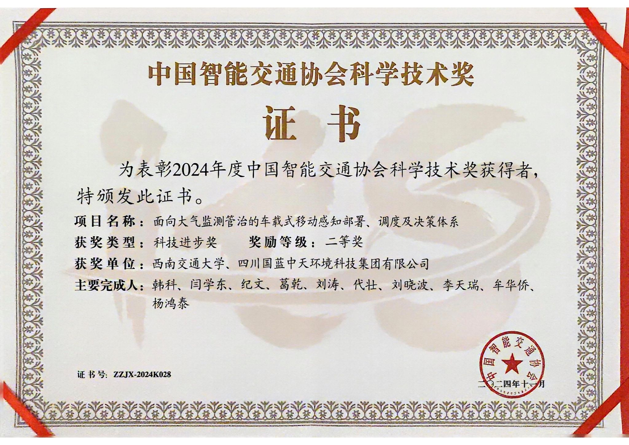 近日,中国智能交通协会公布了2024年度科学技术奖的获奖名单,由我院韩科教授牵头完成的《面向大气监测管治的车载式移动感知部署、调度及决策体系》荣获科技进步二等奖(完成单位:糖心Vlog
