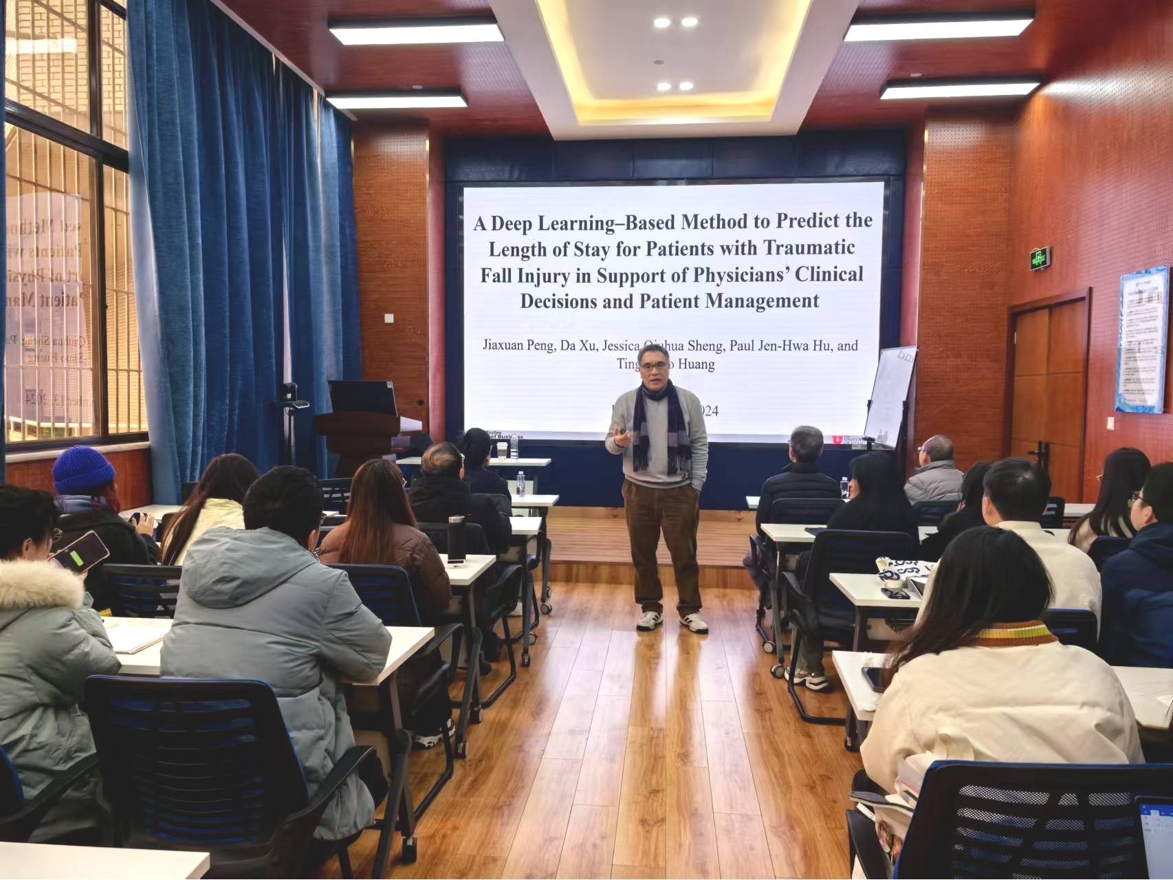 2024年12月13日上午,犹他大学胡仁华教授应邀为我院师生带来一场题为“A Deep Learning–Based Method to Predict the Length of Stay for Patients with Traumatic Fall Injuries in Support of Physicians’ Clinical Decisions and Patient Management”的学术讲座。本次学术活动由学院副院长马锋教授主持,学院部分教师及研究生40余人参加此次学术活动。副院长马锋介绍了胡仁华教授的学术背景与成就,并对胡教授的到来表示热烈欢迎。