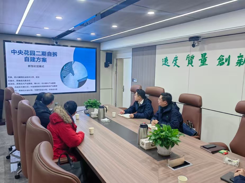 中国华西企业股份有限公司第十二建筑工程公司的东部新区建设公司副总经理童曦等相关负责人 ,热烈欢迎刘继才教授团队的到访,并从公司背景、行业困境及当前项目情况三个方面,详细介绍了公司的现状与发展目标。随后,刘继才教授结合对建筑产业迭代,全过程咨询及建筑新材料、新技术成果转化的优势,介绍了学院工程管理系的整体情况,并对“成都市城市更新-自拆自建”策划咨询实施方案进行了阐述,着重强调了方案的行业落地可行性,并提出以“产学研”深度融合为核心的发展理念,推动高校与企业实现资源共享与优势互补。