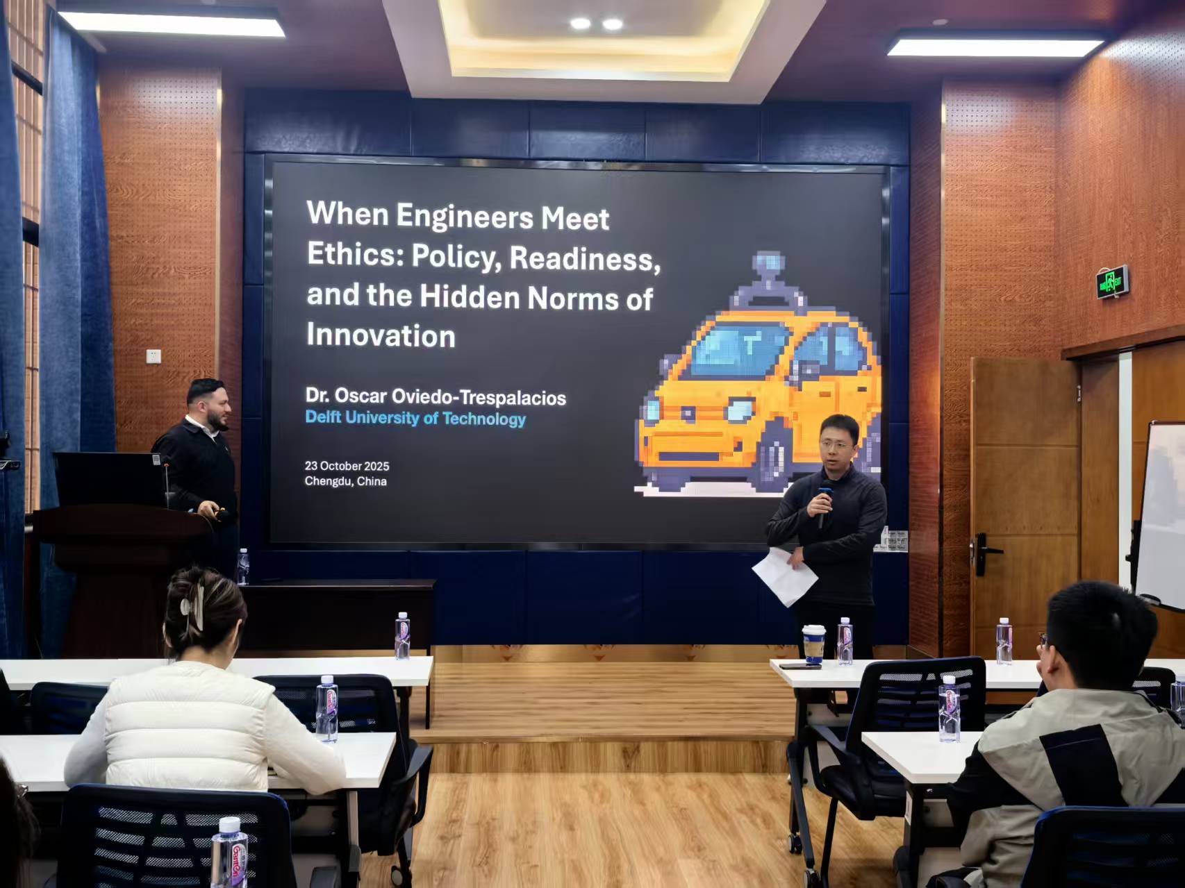 2025年10月23日上午,荷兰代尔夫特理工大学(TU Delft)Oscar Oviedo-Trespalacios副教授应邀在九里校区零号楼0218室为我院师生作了一场题为“When engineers meet ethics: Policy, Readiness, and the Hidden Norms of Innovation”的讲座。本次讲座由学院院长韩科教授主持,学院部分教师及研究生共同参与。韩院长在开场致辞中对Dr. Oscar的学术成就进行了简要介绍,并代表学院对其莅临表示热烈欢迎与诚挚感谢。