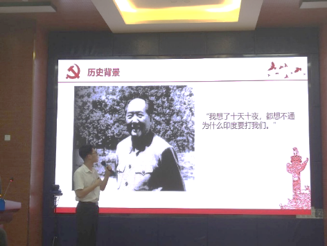 随后,预备党员黄宇译为大家讲述了中印边界自卫保卫战的故事,中印边境自卫反击作战,是中国边防部队在特殊高原地区进行的一次较大规模的反侵略作战。中央军委灵活运用军事、政治、外交手段,不仅取得了军事上的胜利,也取得了政治外交斗争的主动。反击作战部队克服高原、严寒、山高、谷深的困难,大胆运用穿插迂回,分割包围战术手段,发扬吃苦耐劳、英勇顽强的战斗作风,战胜了恶劣的自然环境,胜利地完成了作战任务,保卫了国家领土主权。