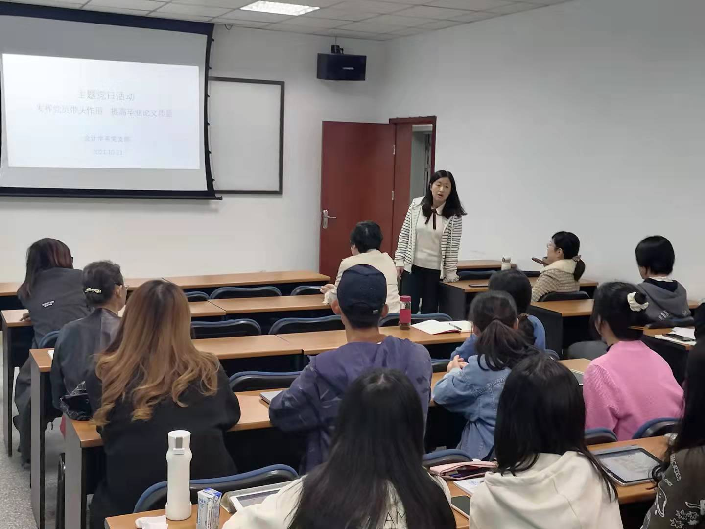 九里校区0316教室,会计学系党支部开展了“发挥党员带头作用,提高毕业论文质量”主题党日活动,学院党委委员、副院长周嘉南同志列席并指导本次主题党日活动。本次主题党日活动的目的在于“发挥党员带头作用,提高毕业论文质量”,具体内容包括会计论文选题、论文研究方法的选择、论文撰写规范、如何处理实习和毕业论文写作关系等。会计学系党支部八位党员教师和二十余位会计专业本科生、会计专业硕士研究生、会计学学术硕士研究生共同参与这次活动。