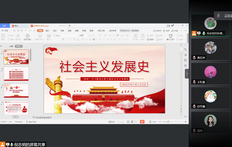 硕士2018级第六党支部专题组织生活会采取线上的方式,在腾讯会议召开。会议由党支部组织委员倪志明同志主讲,硕士2018级第六党支部全体党员参会。会议围绕主题“四史”学习教育之新中国社会主义发展史进行了学习和探讨。