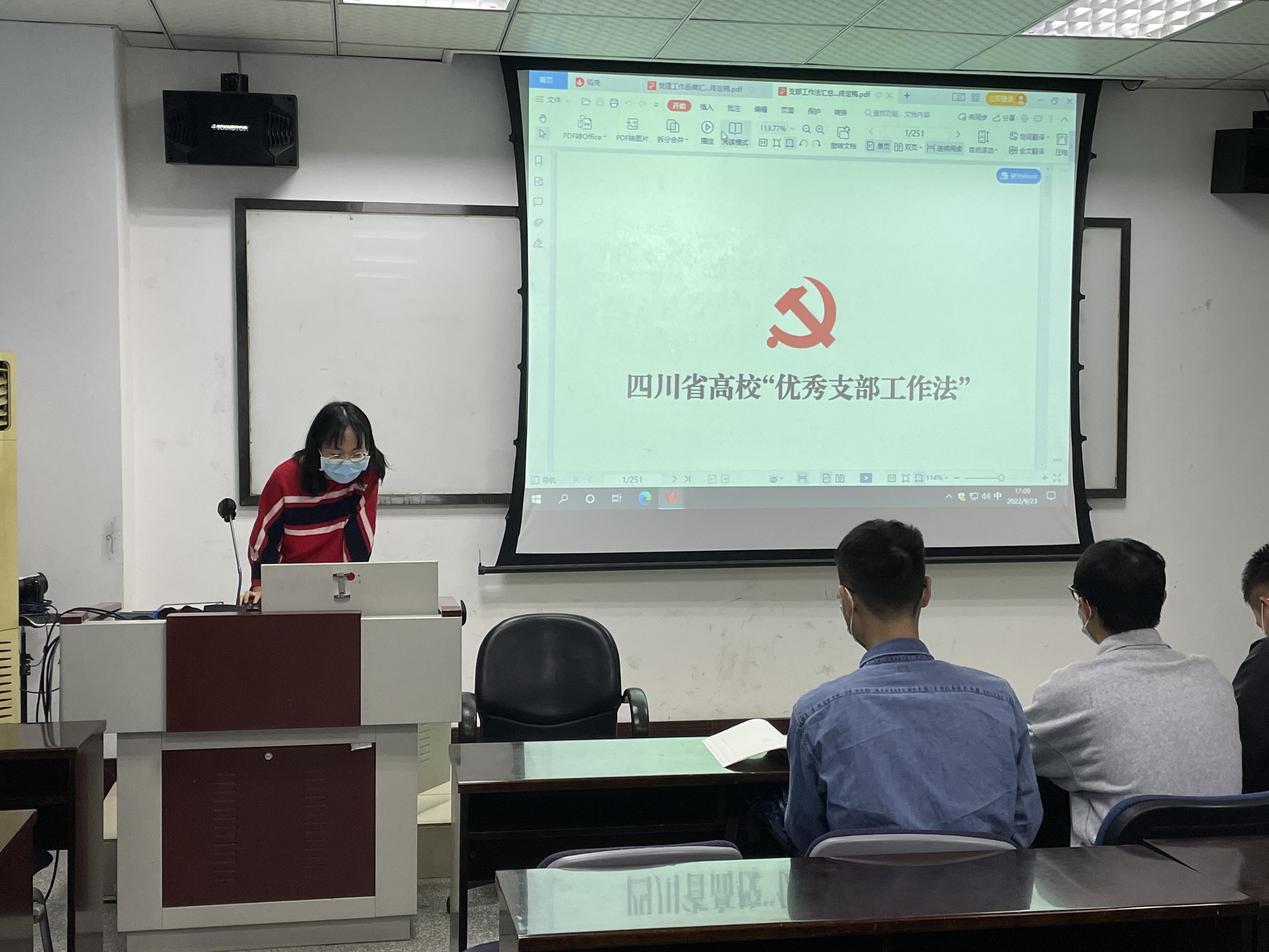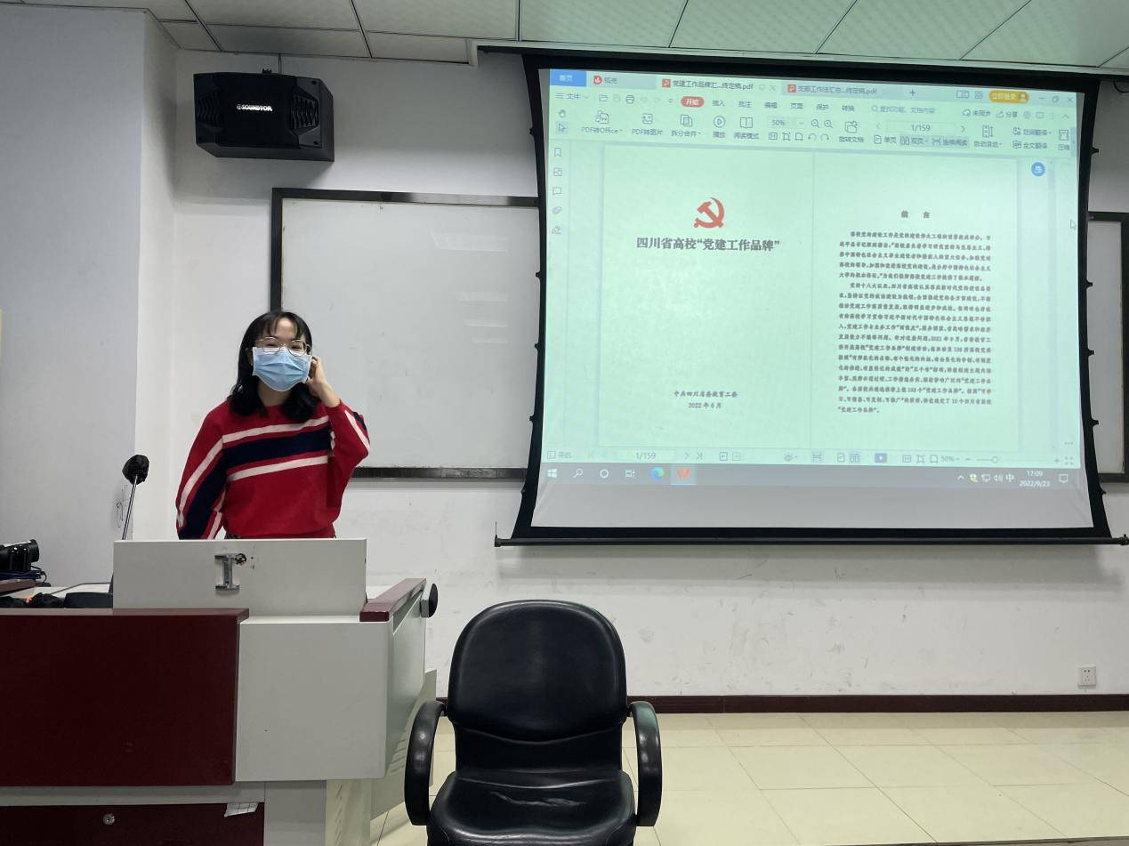 硕士2022级第五党支部在J0317教室顺利开展了新学期第一次政治学习活动,支部成员认真听讲并学习了《四川省高校“党建工作品牌”》和《四川省高校“优秀支部工作法”》,对党建工作与支部建设有了新的认识。