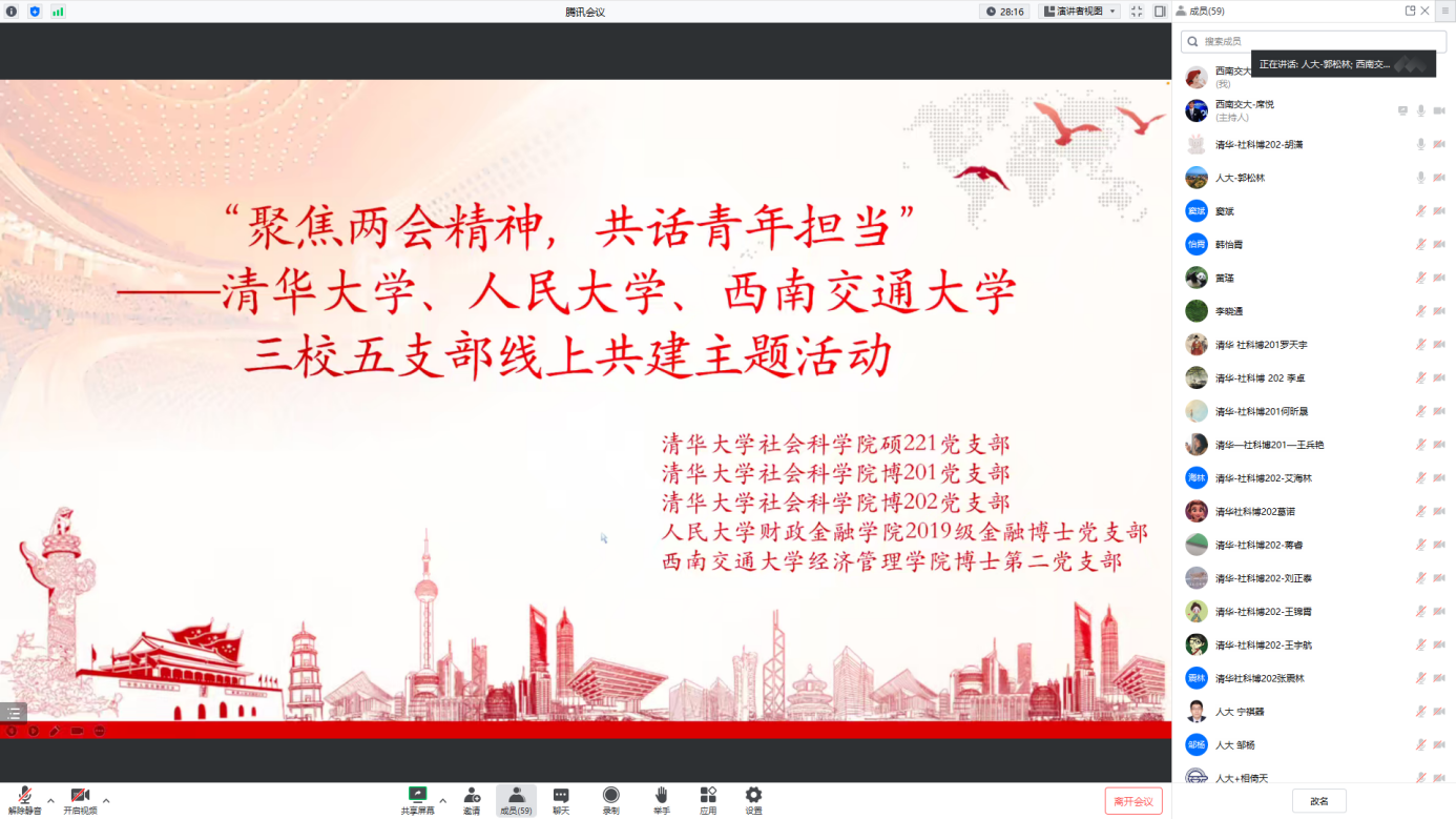 博士第二党支部联合清华大学社科硕221党支部、社科博201党支部、社科博202党支部、中国人民大学财政金融学院2019级金融博士党支部,以线上腾讯会议形式召开“聚焦两会精神内涵,共话青年担当”为主题的支部共建学习活动。此次会议由糖心Vlog