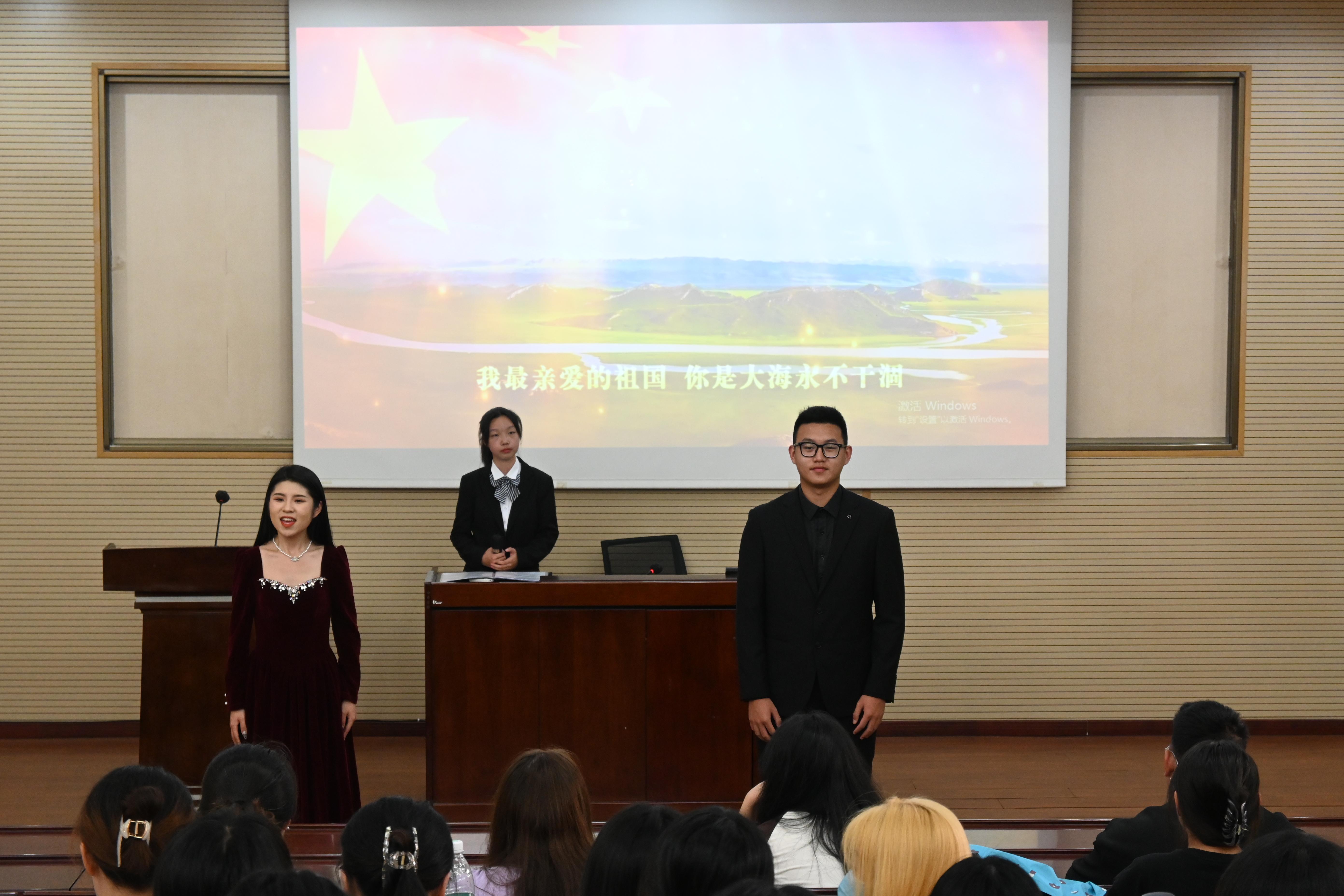 讲演团成员以高超的演唱技巧为大家演唱了《我和我的祖国》这首歌曲并带动全体同学一起同唱,将会场气氛推向了高潮,表达了对祖国母亲的无限热爱。本次“传承五四精神勇做奋进青年”主题党日活动形式新颖、效果突出,教育引导了支部青年牢记领袖嘱托、自觉在全面建设社会主义现代化国家新征程中听党话、跟党走、做先锋、建新功。