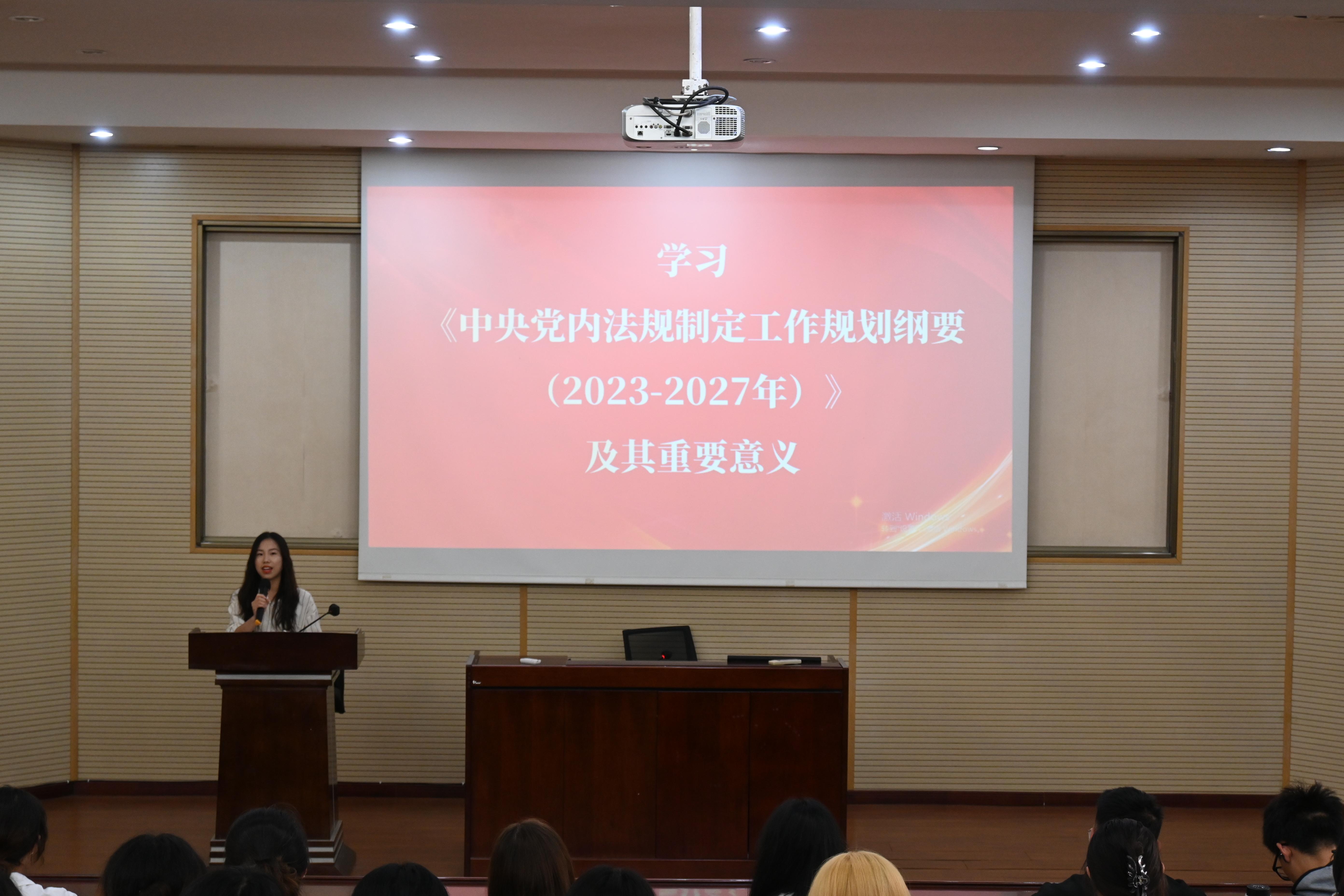 接着,由入党积极分子毛佳、虞丽君、吕瑞怡同学带领大家学习了《中央党内法规制定工作规划纲要(2023-2027年)》及其重要意义。他们从理论、实践层面并结合实际,深入浅出地解读了这份文件的主要内容和目标任务,以及它对于加强党的建设、规范党内政治生活、提高党内法规执行力等方面的指导作用。