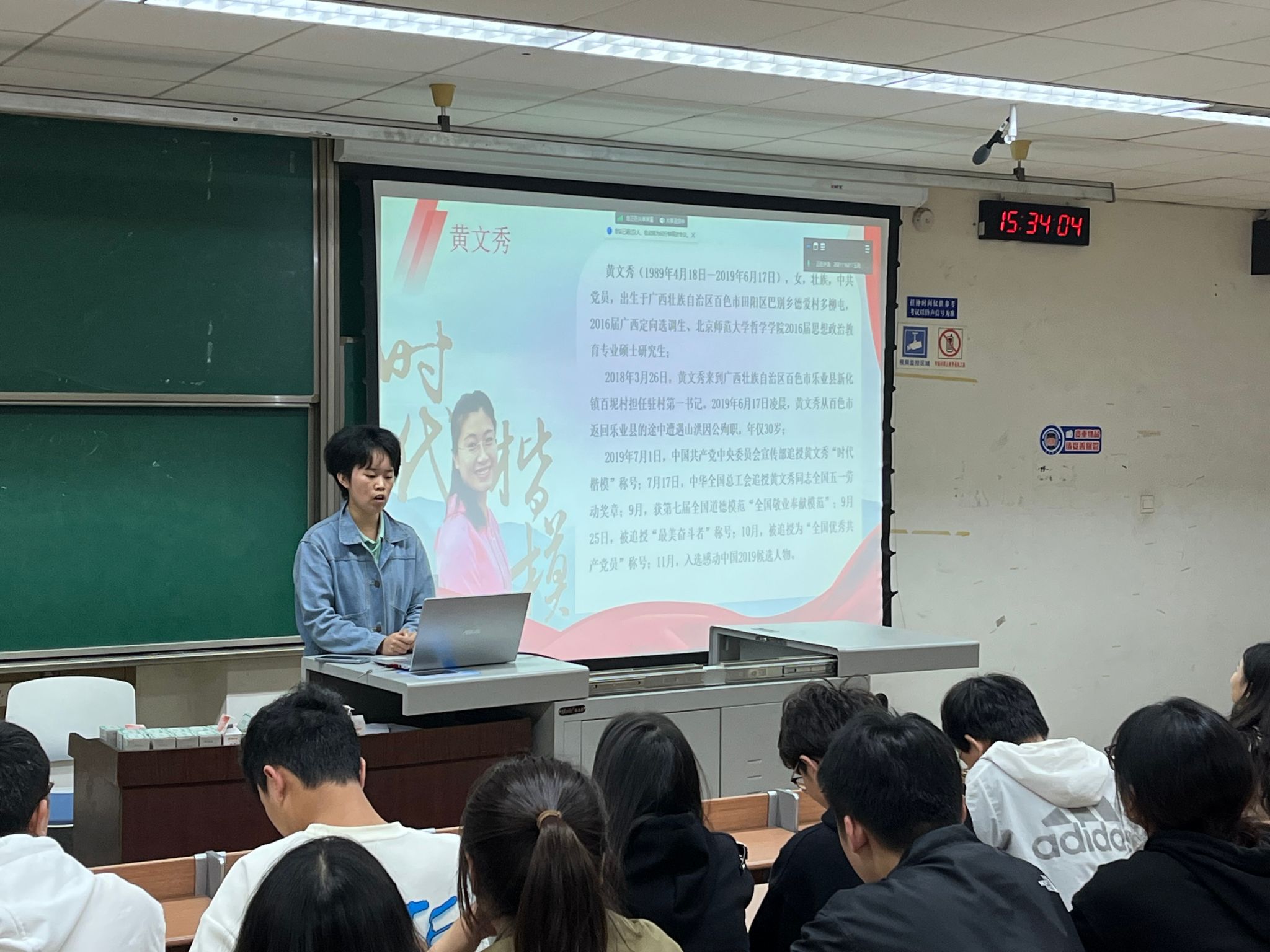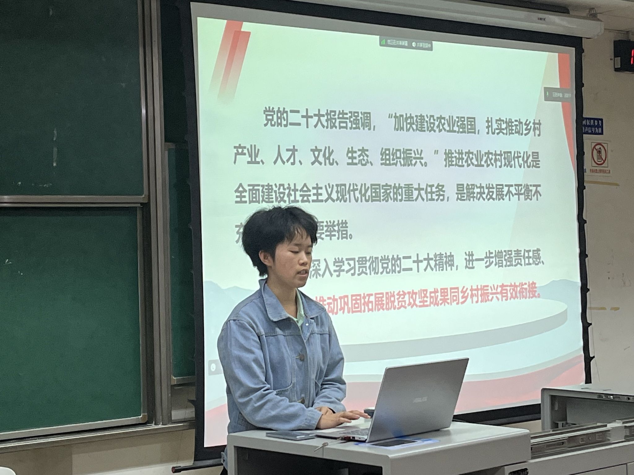 赴百坭村社会实践队的汤权同志从在百坭村的见闻、文秀书记的工作事迹、文秀精神的传承等方面进行了分享。在一年的时间里,黄文秀书记通过不计其数的走访调研,找准发展方向,让百坭村焕发新生。实践队员走进文秀书记工作的地方,看到墙上村里的孩子们用稚嫩的字体写下的“文秀姐姐,我们想你了”,纷纷为之动容。汤权同对大家说,黄文秀同志一生不忘初心、执着坚守、心系村民、甘于奉献,作为新时代的接班人,我们应当学习其事迹,传承其精神,自觉扛起使命担当,在乡村振兴的道路上发光发热,将青春热血镌刻在时代的丰碑上。